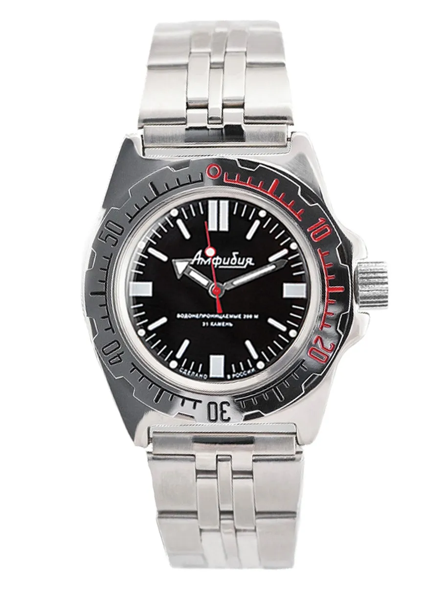 Мужские наручные часы Восток Амфибия 110916. Механические с ручным подзаводом. Браслет из нержавеющей стали. Ударопрочная конструкция часов защищает от ударов и вибрации. Браслет из нержавеющей стали. Органическое стекло. Часы являются водонепроницаемыми до 20 Бар. Цвет циферблата: Серебристый. Цвет корпуса: Черный. На стрелки и отметки нанесен светонакопительный состав, благодаря этому считывать информацию с циферблата возможно и в темноте. Толщина: 15 мм. Гарантия: 1 год.