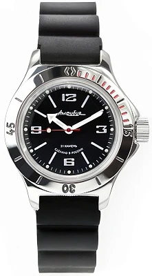 Мужские наручные часы Восток Амфибия 120512. Механические с автоподзаводом. Пружина механизма заводится автоматически благодаря естественным движениям владельца в процессе ежедневной носки часов. Корпус изготовлен из высококачественной нержавеющей стали 316L с высокими антикоррозийными свойствами. На стрелки и отметки нанесен светонакопительный состав, благодаря этому считывать информацию с циферблата возможно и в темноте. Полимерный ремешок. Натуральный полимерный материал является идеальным для изготовления ремешка благодаря своей чрезвычайной прочности и гибкости. Органическое стекло. Часы являются водонепроницаемыми до 20 Бар. Цвет корпуса: Черный. Цвет циферблата: Черный. Ширина (с заводной головкой): 42мм. Толщина: 15мм. Гарантия: 1 год.