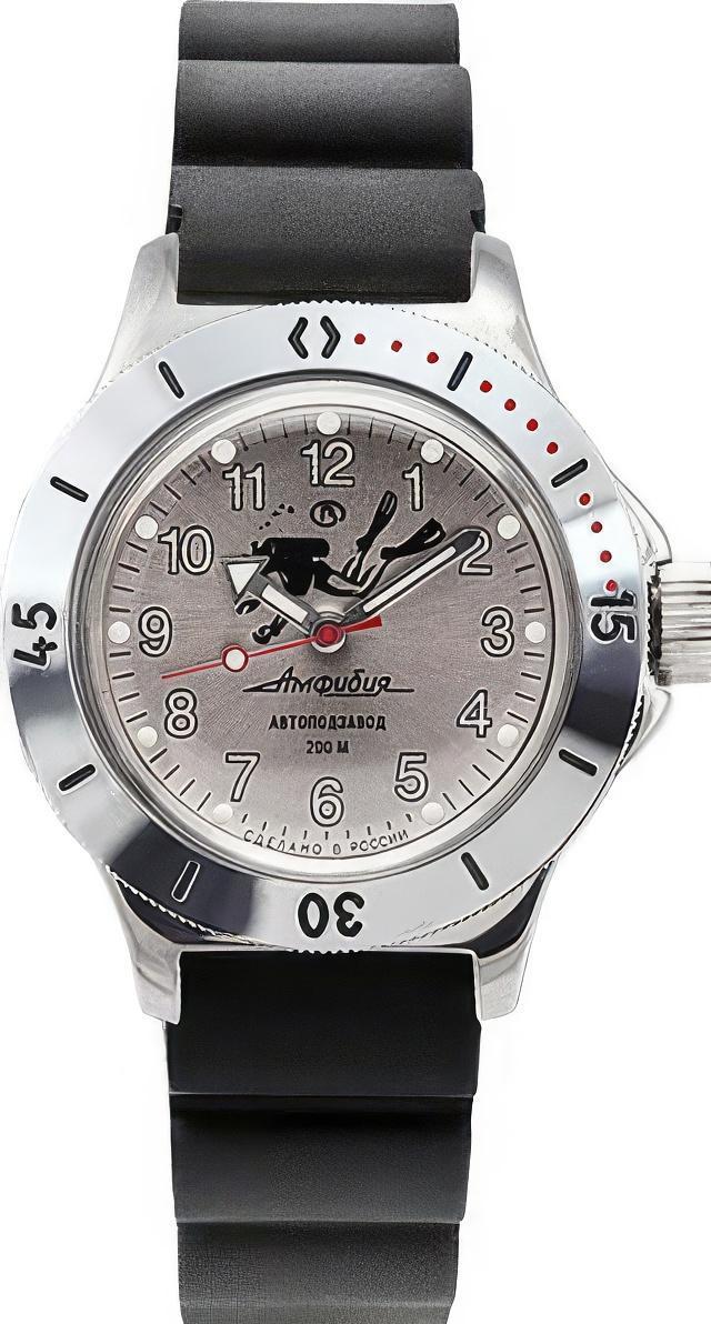Мужские наручные часы Восток Амфибия 120658. Автоматические с ручным подзаводом. Пружина механизма заводится автоматически благодаря естественным движениям владельца в процессе ежедневной носки часов. Также есть возможность ручного завода. Корпус изготовлен из высококачественной нержавеющей стали 316L с высокими антикоррозийными свойствами. На стрелки и отметки нанесен светонакопительный состав, благодаря этому считывать информацию с циферблата возможно и в темноте. Ремешок изготовлен из каучука. Органическое стекло. Часы являются водонепроницаемыми до 20 Бар. Цвет корпуса: Серый. Цвет циферблата: Серый. Ширина (с заводной головкой): 42мм. Толщина: 15мм. Гарантия: 1 год.