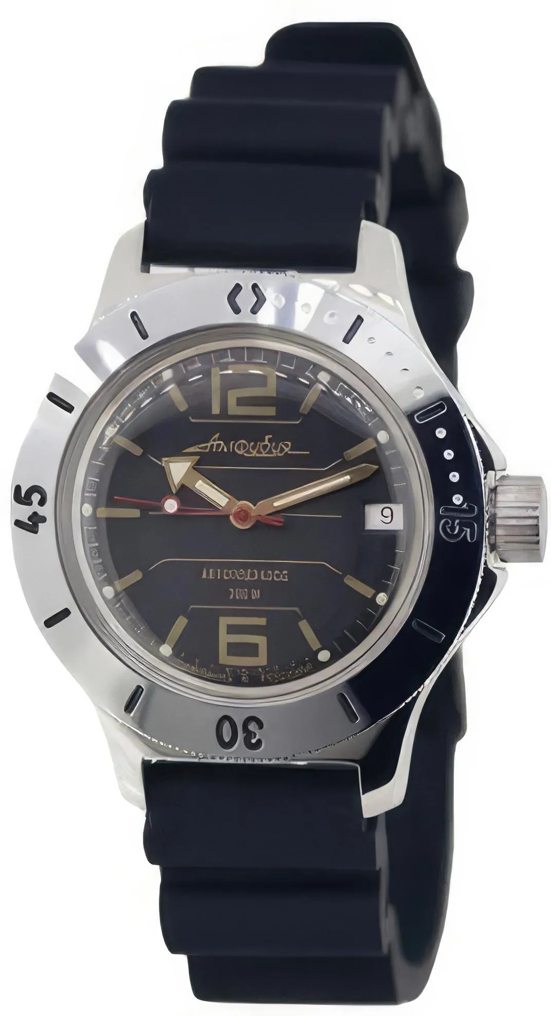Мужские наручные часы Восток Амфибия 120697. Механические с автоподзаводом. Пружина механизма заводится автоматически благодаря естественным движениям владельца в процессе ежедневной носки часов. Корпус изготовлен из высококачественной нержавеющей стали 316L с высокими антикоррозийными свойствами. На стрелки и отметки нанесен светонакопительный состав, благодаря этому считывать информацию с циферблата возможно и в темноте. На циферблате отображается текущее число месяца. Ремешок изготовлен из каучука. Органическое стекло. Часы являются водонепроницаемыми до 20 Бар. Цвет корпуса: Черный. Цвет циферблата: Черный. Ширина (с заводной головкой): 42мм. Толщина: 15мм. Гарантия: 1 год.