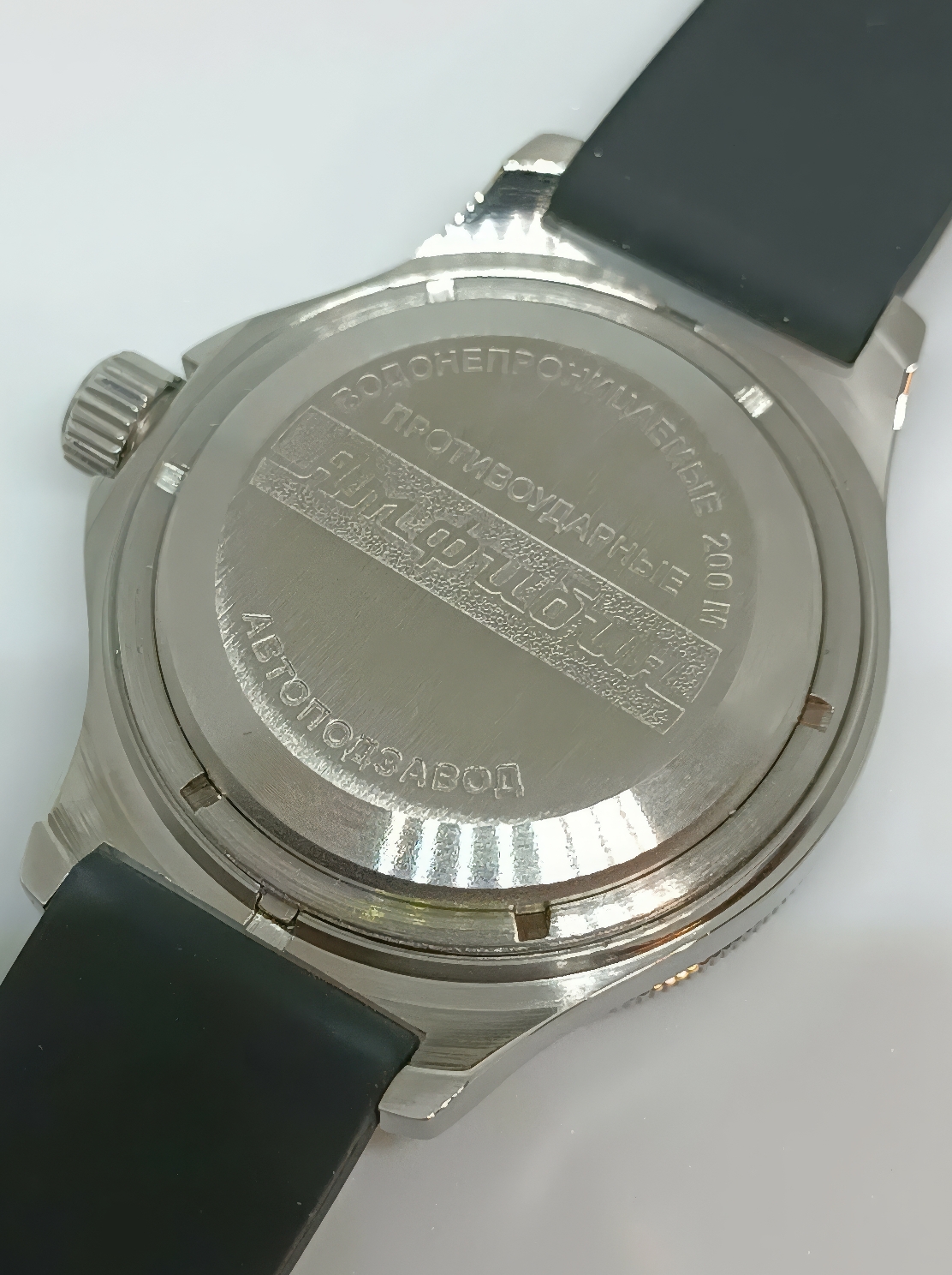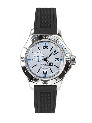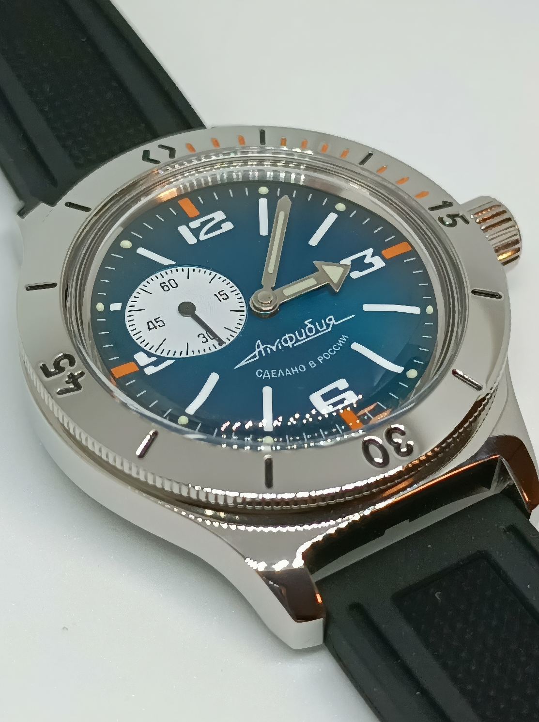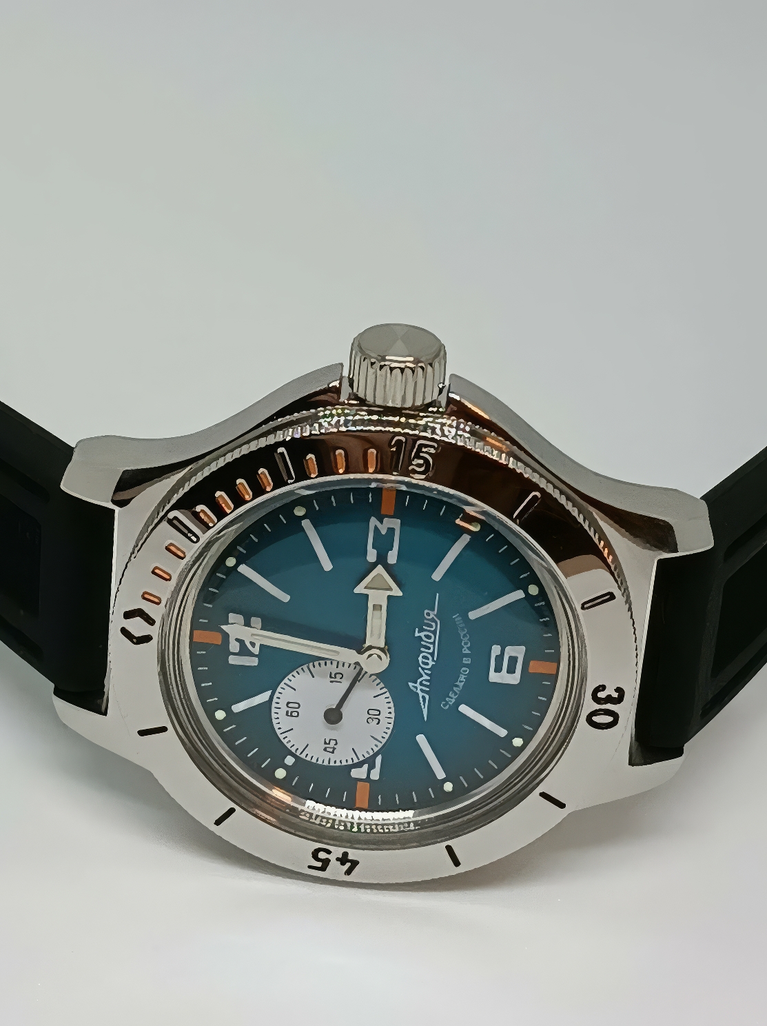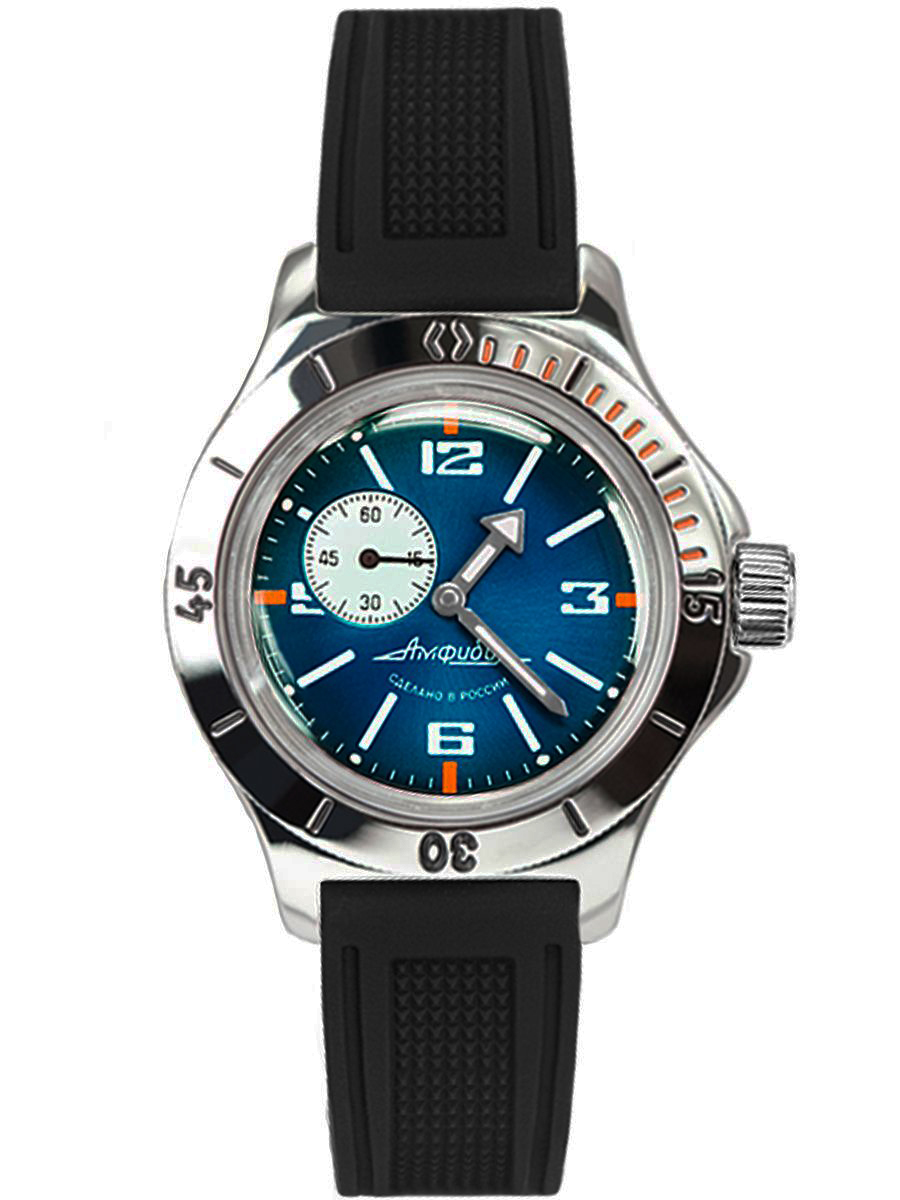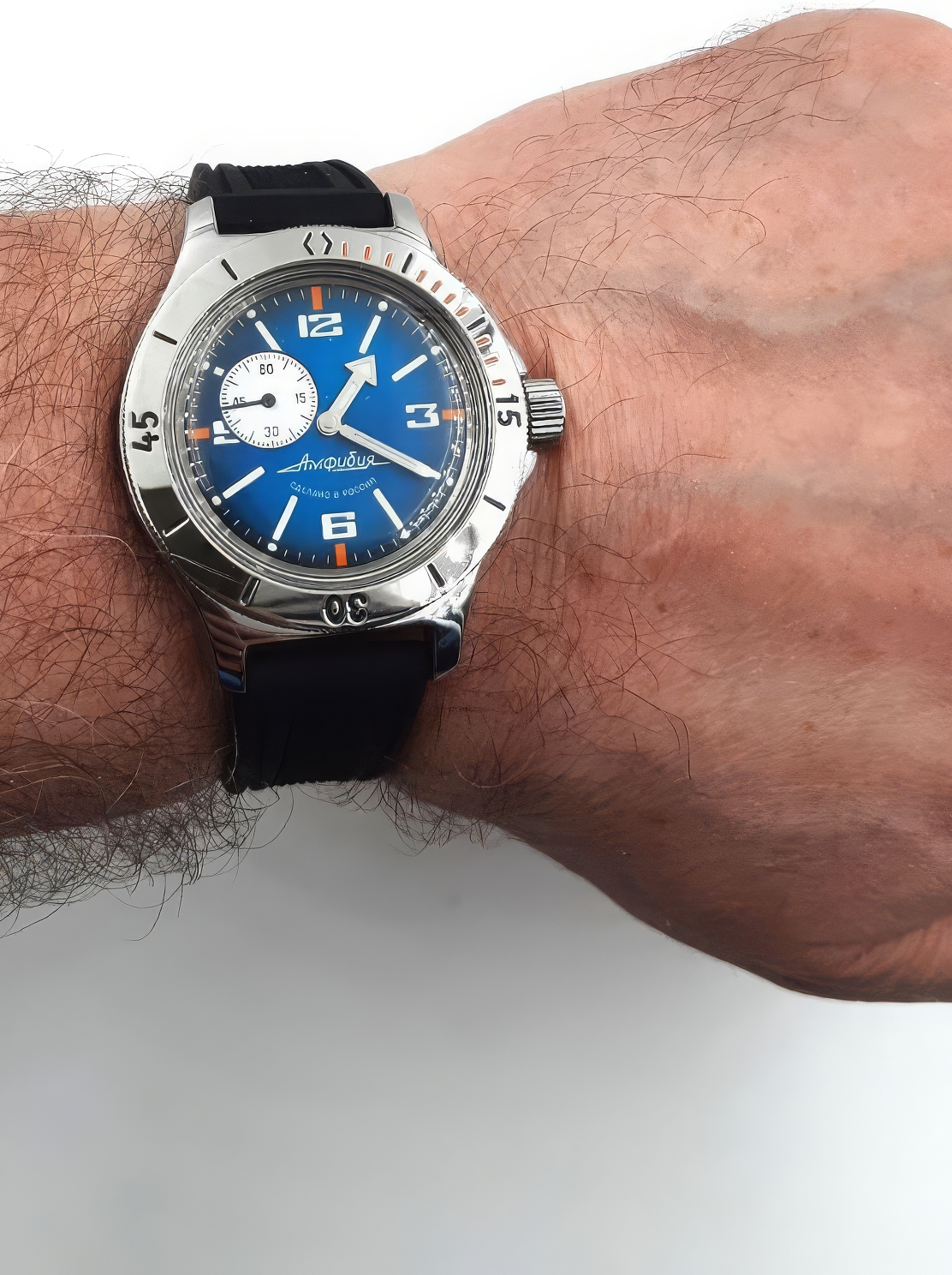 Мужские наручные часы Восток Амфибия 12072Б. Механические с ручным подзаводом. Текстильный ремешок. Ударопрочная конструкция часов защищает от ударов и вибрации. Браслет из нержавеющей стали. Органическое стекло. Часы являются водонепроницаемыми до 20 Бар. Цвет циферблата: Серебристый. Цвет корпуса: Синий. На стрелки и отметки нанесен светонакопительный состав, благодаря этому считывать информацию с циферблата возможно и в темноте. Высота (с ушками): 48 мм. Толщина: 15 мм. Гарантия: 1 год.