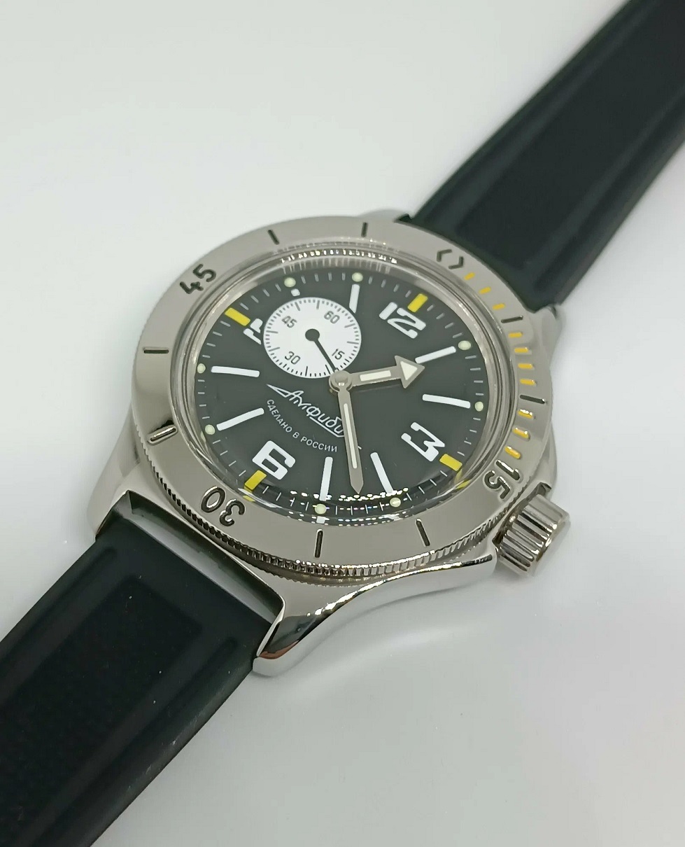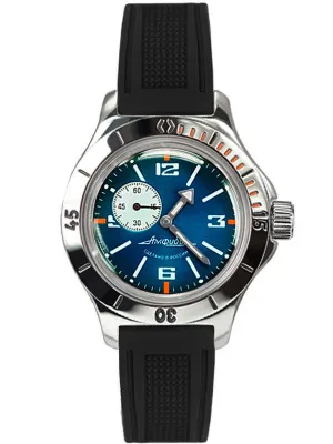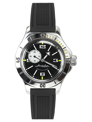Мужские наручные часы Восток Амфибия 12073Б. Механические с ручным подзаводом. Полимерный ремешок. Натуральный полимерный материал является идеальным для изготовления ремешка благодаря своей чрезвычайной прочности и гибкости. Ударопрочная конструкция часов защищает от ударов и вибрации. Браслет из нержавеющей стали. Органическое стекло. Часы являются водонепроницаемыми до 20 Бар. Цвет циферблата: Серебристый. Цвет корпуса: Черный. На стрелки и отметки нанесен светонакопительный состав, благодаря этому считывать информацию с циферблата возможно и в темноте. Толщина: 15 мм. Гарантия: 1 год.