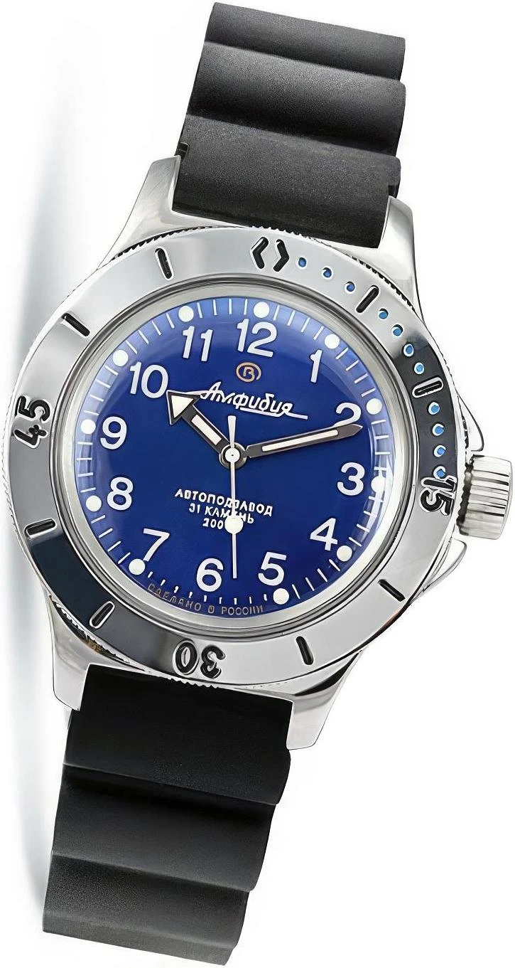 Мужские наручные часы Восток Амфибия 120812. Механические с автоподзаводом. Пружина механизма заводится автоматически благодаря естественным движениям владельца в процессе ежедневной носки часов. Корпус изготовлен из высококачественной нержавеющей стали 316L с высокими антикоррозийными свойствами. На стрелки и отметки нанесен светонакопительный состав, благодаря этому считывать информацию с циферблата возможно и в темноте. Ремешок изготовлен из каучука. Органическое стекло. Часы являются водонепроницаемыми до 20 Бар. Цвет корпуса: Синий. Цвет циферблата: Синий. Ширина (с заводной головкой): 42мм. Толщина: 15мм. Гарантия: 1 год.