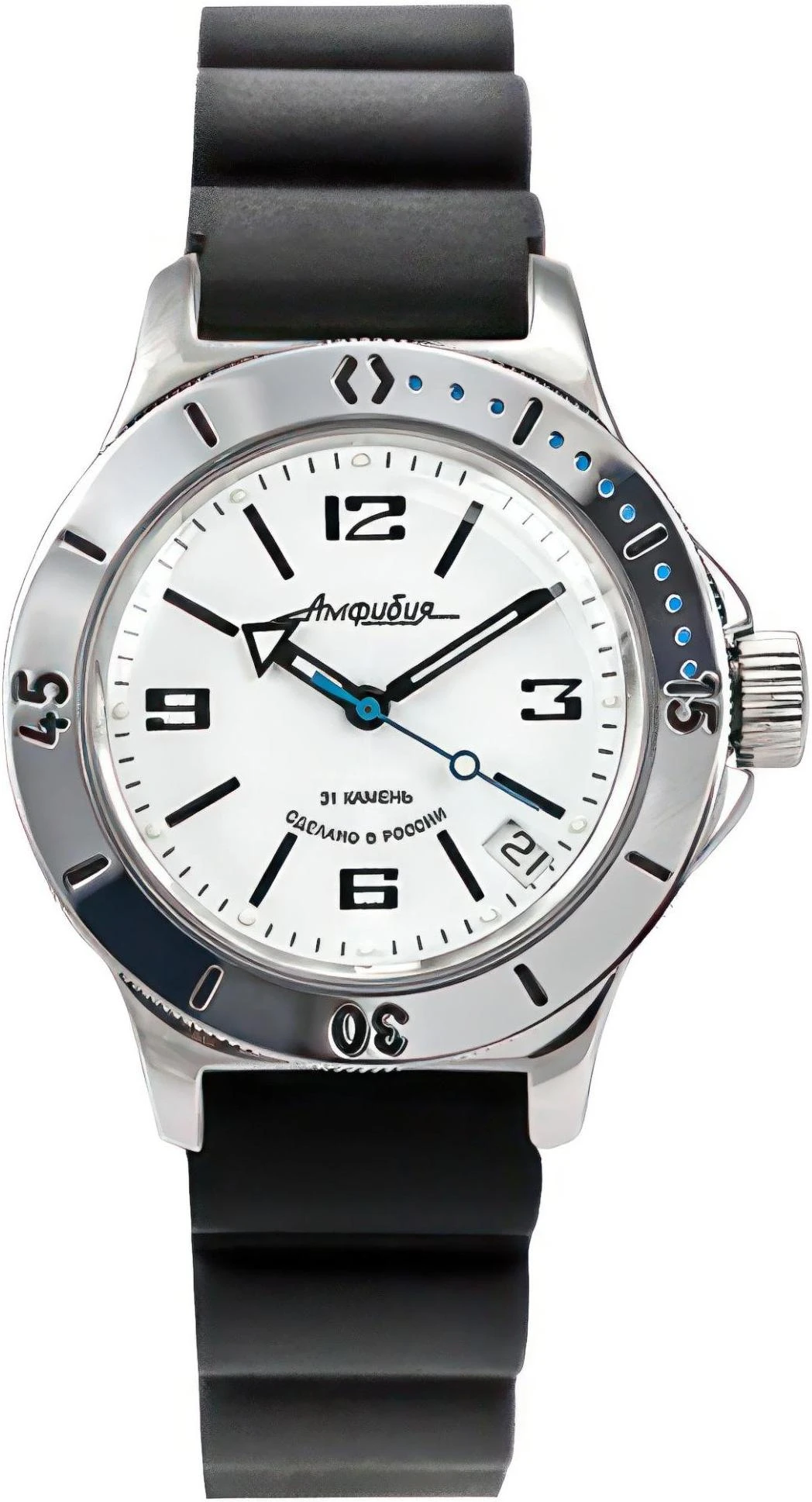 Мужские наручные часы Восток Амфибия 120847. Механические с автоподзаводом. Пружина механизма заводится автоматически благодаря естественным движениям владельца в процессе ежедневной носки часов. Корпус изготовлен из высококачественной нержавеющей стали 316L с высокими антикоррозийными свойствами. На стрелки и отметки нанесен светонакопительный состав, благодаря этому считывать информацию с циферблата возможно и в темноте. На циферблате отображается текущее число месяца. Ремень из полиуретана. Органическое стекло. Часы являются водонепроницаемыми до 20 Бар. Цвет корпуса: Белый. Цвет циферблата: Белый. Ширина (с заводной головкой): 42мм. Толщина: 15мм. Гарантия: 1 год.