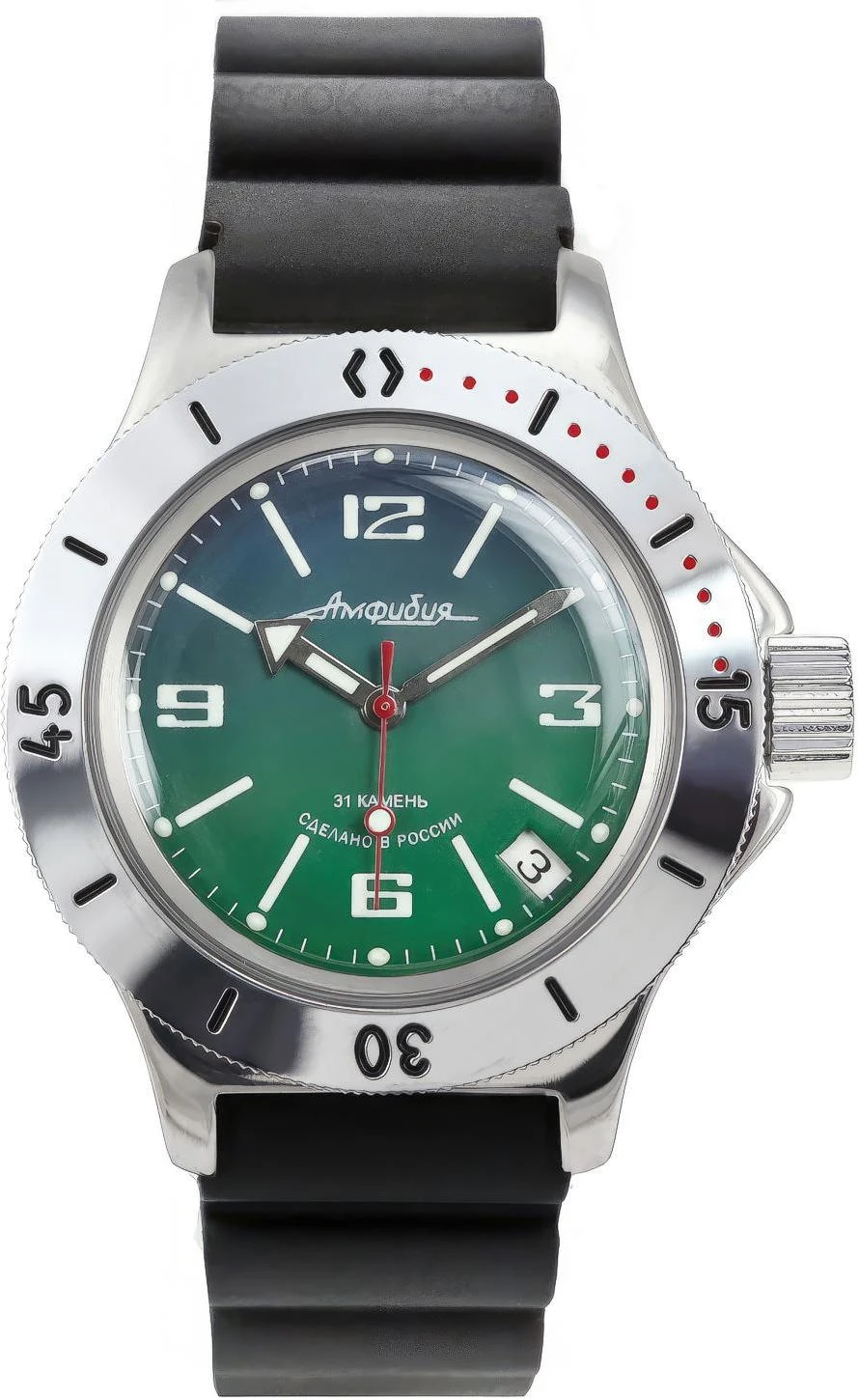 Мужские наручные часы Восток Амфибия 120848. Механические с автоподзаводом. Пружина механизма заводится автоматически благодаря естественным движениям владельца в процессе ежедневной носки часов. Корпус изготовлен из высококачественной нержавеющей стали 316L с высокими антикоррозийными свойствами. На стрелки и отметки нанесен светонакопительный состав, благодаря этому считывать информацию с циферблата возможно и в темноте. На циферблате отображается текущее число месяца. Браслет из нержавеющей стали. Органическое стекло. Часы являются водонепроницаемыми до 20 Бар. Цвет корпуса: Двухцветный. Цвет циферблата: Зеленый. Ширина (с заводной головкой): 42мм. Толщина: 15мм. Гарантия: 1 год.