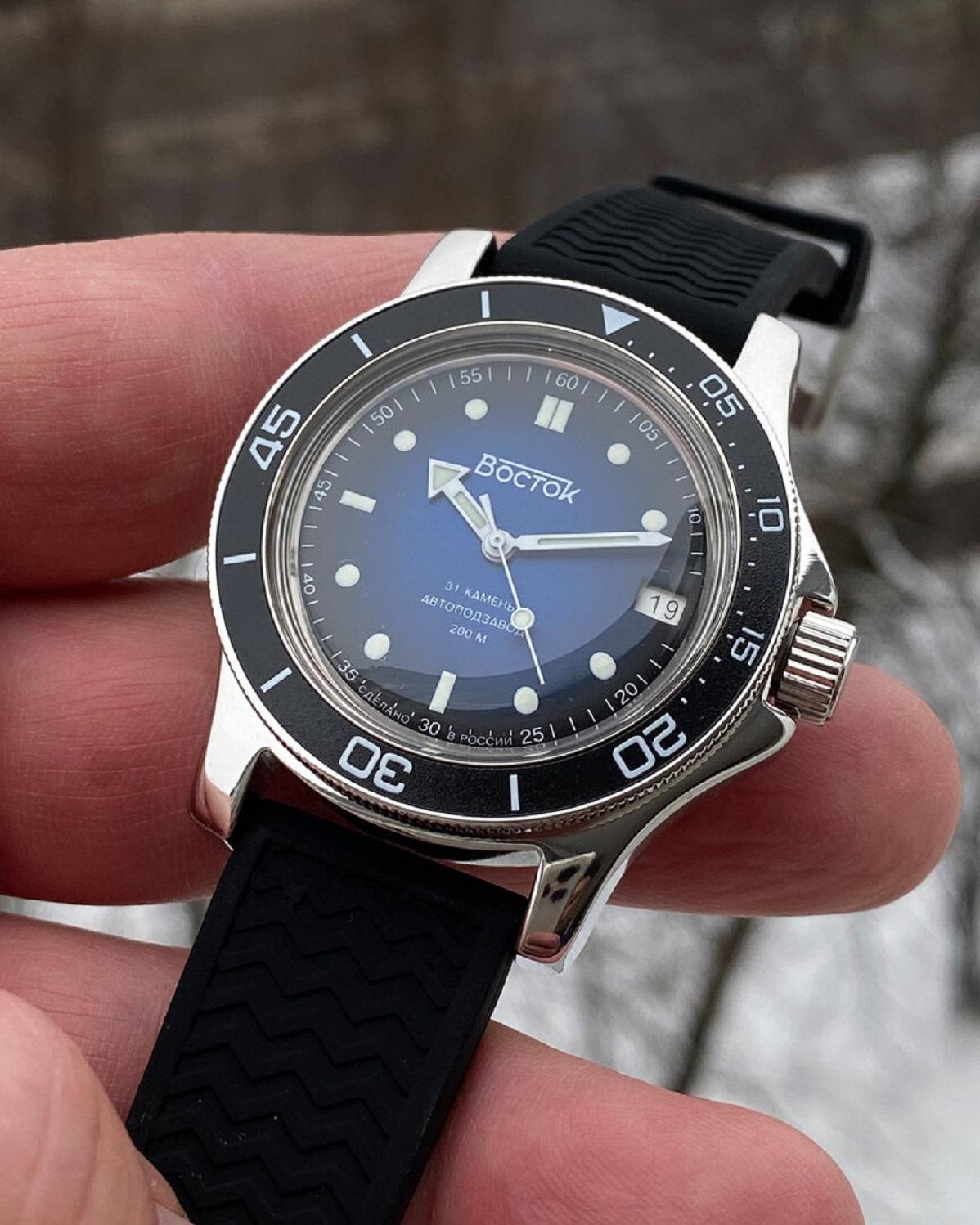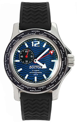 Мужские наручные часы Восток Амфибия 13005В. Механические с ручным подзаводом. Ремешок изготовлен из каучука. Браслет из нержавеющей стали. Органическое стекло. На циферблате отображается текущее число месяца. Часы являются водонепроницаемыми до 20 Бар. Цвет циферблата: Черный. Цвет корпуса: Синий. На стрелки и отметки нанесен светонакопительный состав, благодаря этому считывать информацию с циферблата возможно и в темноте. Высота (с ушками): 49 мм. Толщина: 15 мм. Гарантия: 1 год.
