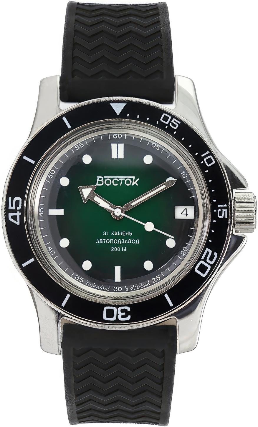 Мужские наручные часы Восток Амфибия 13026А. Механические с ручным подзаводом. Полимерный ремешок. Натуральный полимерный материал является идеальным для изготовления ремешка благодаря своей чрезвычайной прочности и гибкости. Органическое стекло. На циферблате отображается текущее число месяца. Часы являются водонепроницаемыми до 20 Бар. Цвет циферблата: Серебристый. Цвет циферблата: Черный. Цвет корпуса: Зеленый. На стрелки и отметки нанесен светонакопительный состав, благодаря этому считывать информацию с циферблата возможно и в темноте. Толщина: 12 мм. Гарантия: 1 год.
