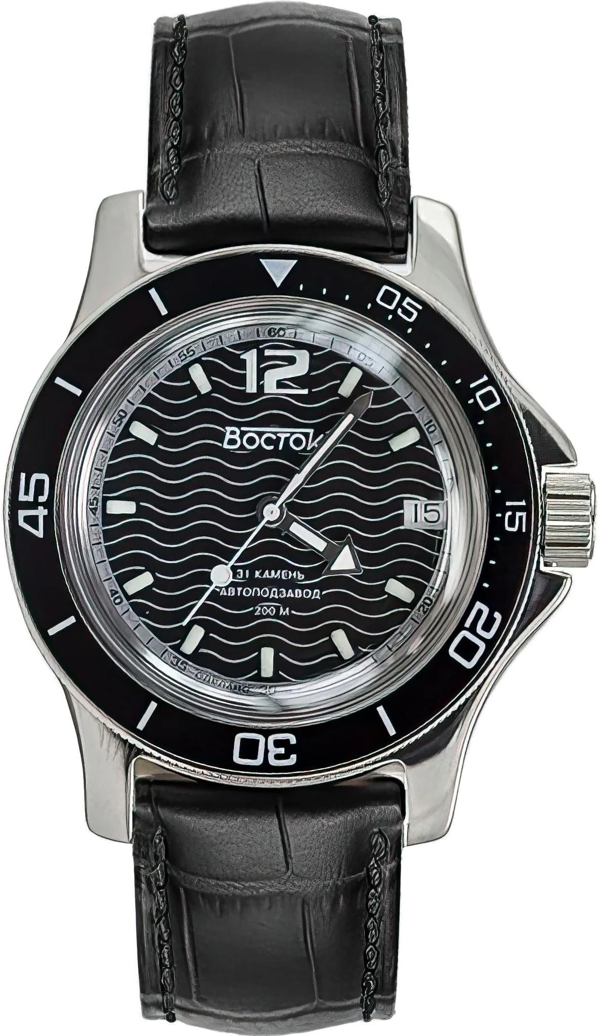 Мужские наручные часы Восток Амфибия 13042А. Механические с ручным подзаводом. Ремешок изготовлен из кожи. Браслет из нержавеющей стали. Органическое стекло. На циферблате отображается текущее число месяца. Часы являются водонепроницаемыми до 20 Бар. Цвет циферблата: Серебристый. Цвет циферблата: Черный. Цвет корпуса: Черный. На стрелки и отметки нанесен светонакопительный состав, благодаря этому считывать информацию с циферблата возможно и в темноте. Толщина: 12 мм. Гарантия: 1 год.