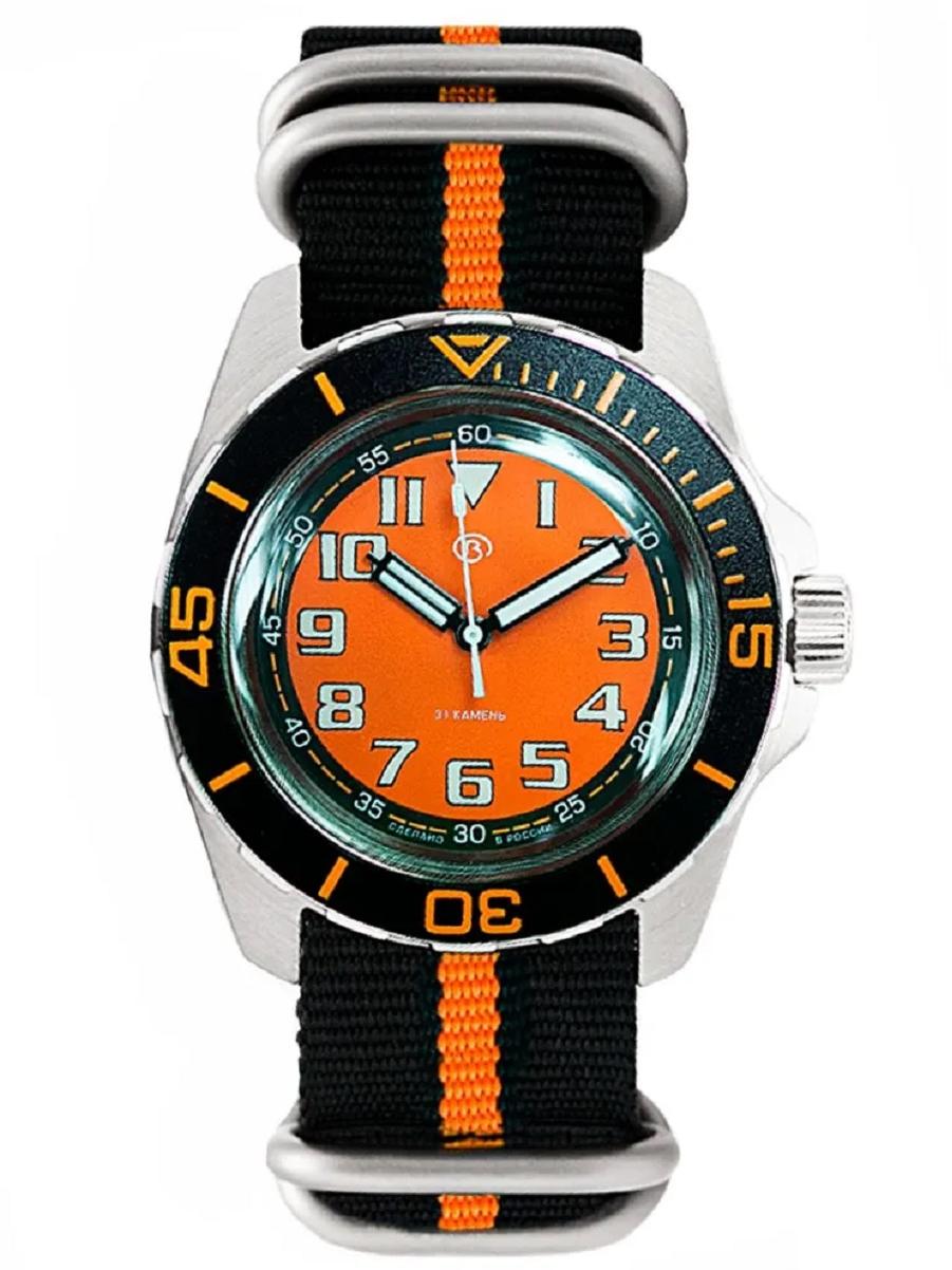 Мужские наручные часы Восток Амфибия 14034В. Механические с ручным подзаводом. Текстильный ремешок. Ударопрочная конструкция часов защищает от ударов и вибрации. Браслет из нержавеющей стали. Органическое стекло. Часы являются водонепроницаемыми до 20 Бар. Цвет циферблата: Черный. Цвет корпуса: Оранжевый. На стрелки и отметки нанесен светонакопительный состав, благодаря этому считывать информацию с циферблата возможно и в темноте. Толщина: 15 мм. Гарантия: 1 год.