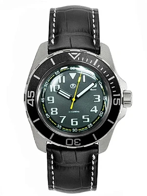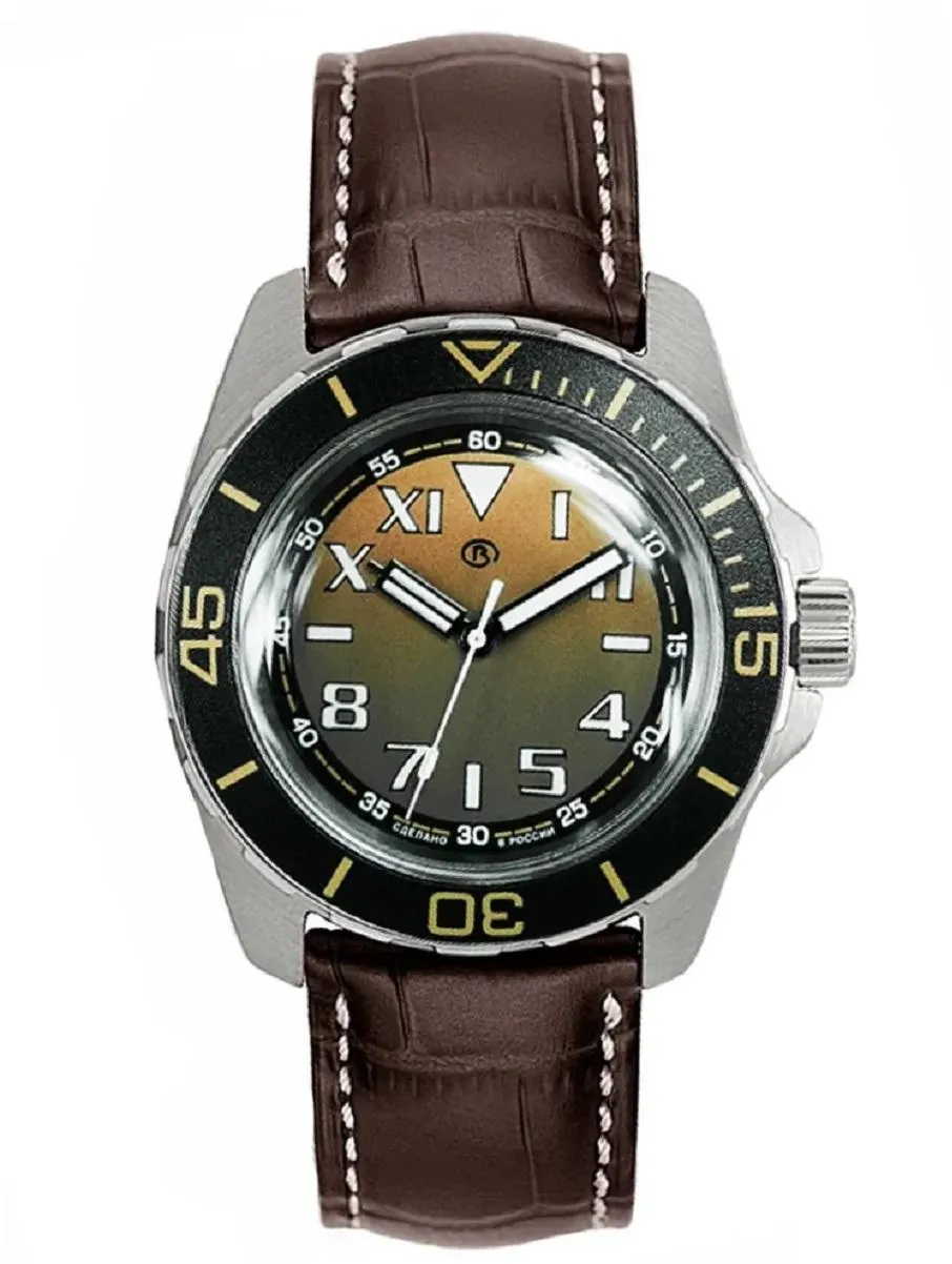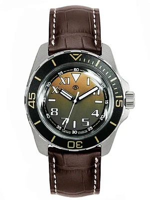Мужские наручные часы Восток Амфибия 14064Б. Механические с ручным подзаводом. Ремешок изготовлен из кожи. Ударопрочная конструкция часов защищает от ударов и вибрации. Браслет из нержавеющей стали. Органическое стекло. Часы являются водонепроницаемыми до 20 Бар. Цвет циферблата: Черный. Цвет корпуса: Коричневый. На стрелки и отметки нанесен светонакопительный состав, благодаря этому считывать информацию с циферблата возможно и в темноте. Толщина: 15 мм. Гарантия: 1 год.