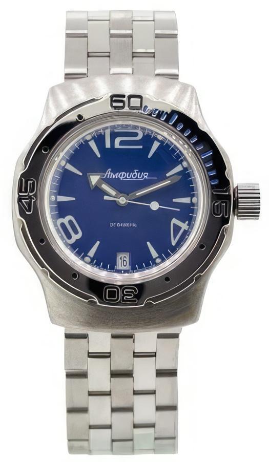 Мужские наручные часы Восток Амфибия 160272. Механические с автоподзаводом. Пружина механизма заводится автоматически благодаря естественным движениям владельца в процессе ежедневной носки часов. Корпус изготовлен из высококачественной нержавеющей стали 316L с высокими антикоррозийными свойствами. На стрелки и отметки нанесен светонакопительный состав, благодаря этому считывать информацию с циферблата возможно и в темноте. На циферблате отображается текущее число месяца. Браслет из нержавеющей стали. Органическое стекло. Часы являются водонепроницаемыми до 20 Бар. Цвет корпуса: Синий. Цвет циферблата: Синий. Ширина (с заводной головкой): 42мм. Толщина: 15мм. Гарантия: 1 год.