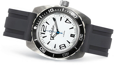 Мужские наручные часы Восток Амфибия 170273. Механические с ручным подзаводом. Полимерный ремешок. Натуральный полимерный материал является идеальным для изготовления ремешка благодаря своей чрезвычайной прочности и гибкости. Браслет из нержавеющей стали. Органическое стекло. Часы являются водонепроницаемыми до 20 Бар. Цвет циферблата: Серебристый. Цвет циферблата: Черный. Цвет корпуса: Белый. На стрелки и отметки нанесен светонакопительный состав, благодаря этому считывать информацию с циферблата возможно и в темноте. Толщина: 15 мм. Гарантия: 1 год.
