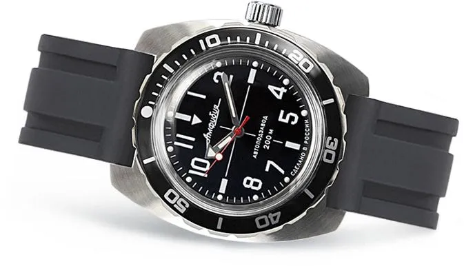 Мужские наручные часы Восток Амфибия 170647. Механические с ручным подзаводом. Силиконовый ремешок. Браслет из нержавеющей стали. Органическое стекло. Часы являются водонепроницаемыми до 20 Бар. Цвет циферблата: Серебристый. Цвет циферблата: Черный. Цвет корпуса: Черный. На стрелки и отметки нанесен светонакопительный состав, благодаря этому считывать информацию с циферблата возможно и в темноте. Толщина: 10 мм. Гарантия: 1 год.