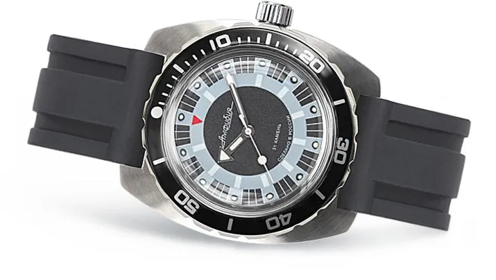 Мужские наручные часы Восток Амфибия 170927. Механические с ручным подзаводом. Полимерный ремешок. Натуральный полимерный материал является идеальным для изготовления ремешка благодаря своей чрезвычайной прочности и гибкости. Браслет из нержавеющей стали. Органическое стекло. Часы являются водонепроницаемыми до 20 Бар. Цвет циферблата: Серебристый. Цвет корпуса: Голубой. Цвет корпуса: Черный. На стрелки и отметки нанесен светонакопительный состав, благодаря этому считывать информацию с циферблата возможно и в темноте. Толщина: 15 мм. Гарантия: 1 год.
