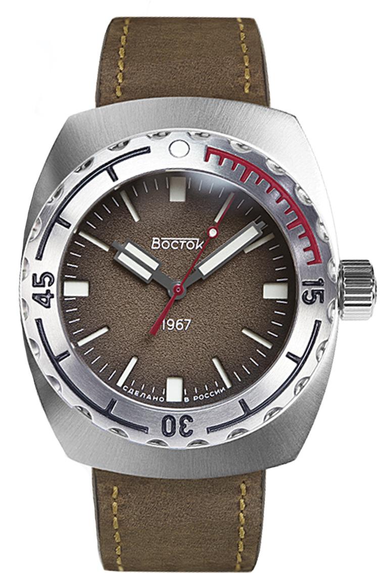 Мужские наручные часы Восток Амфибия 190060. Механические с ручным подзаводом. Ремешок изготовлен из кожи. Ударопрочная конструкция часов защищает от ударов и вибрации. Браслет из нержавеющей стали. Сапфировое стекло. Искусственно изготовленное стекло с высокой прочностью и устойчивостью к царапинам. Часы являются водонепроницаемыми до 20 Бар. Цвет циферблата: Серебристый. Цвет корпуса: Коричневый. На стрелки и отметки нанесен светонакопительный состав, благодаря этому считывать информацию с циферблата возможно и в темноте. Высота (с ушками): 50 мм. Толщина: 15 мм. Гарантия: 1 год.