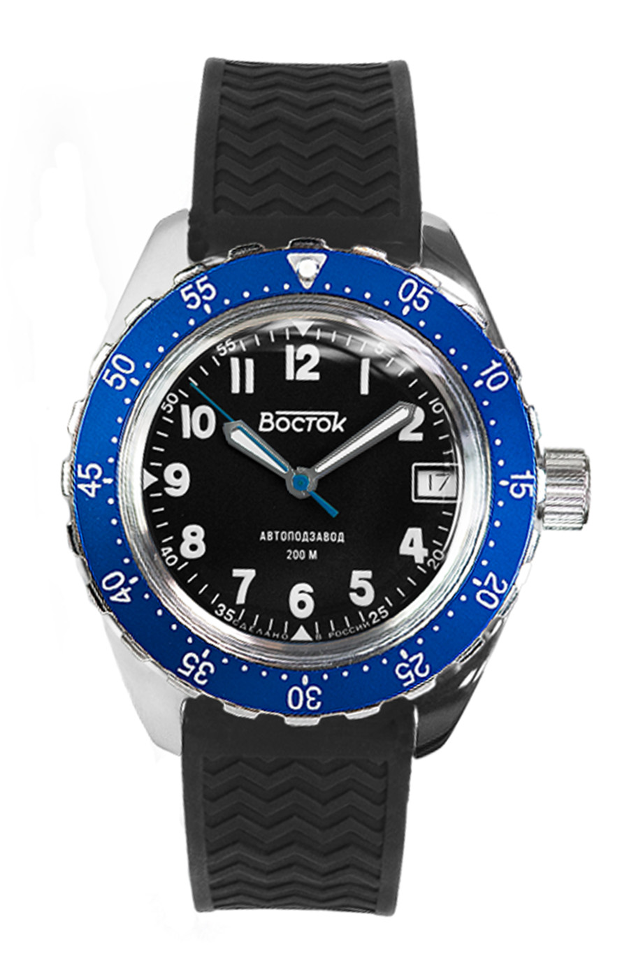 Мужские наручные часы Восток Амфибия 20002В. Механические с ручным подзаводом. Силиконовый ремешок. Ударопрочная конструкция часов защищает от ударов и вибрации. Браслет из нержавеющей стали. Органическое стекло. На циферблате отображается текущее число месяца. Часы являются водонепроницаемыми до 20 Бар. Цвет циферблата: Синий. Цвет корпуса: Черный. На стрелки и отметки нанесен светонакопительный состав, благодаря этому считывать информацию с циферблата возможно и в темноте. Высота (с ушками): 49 мм. Толщина: 15 мм. Гарантия: 1 год.