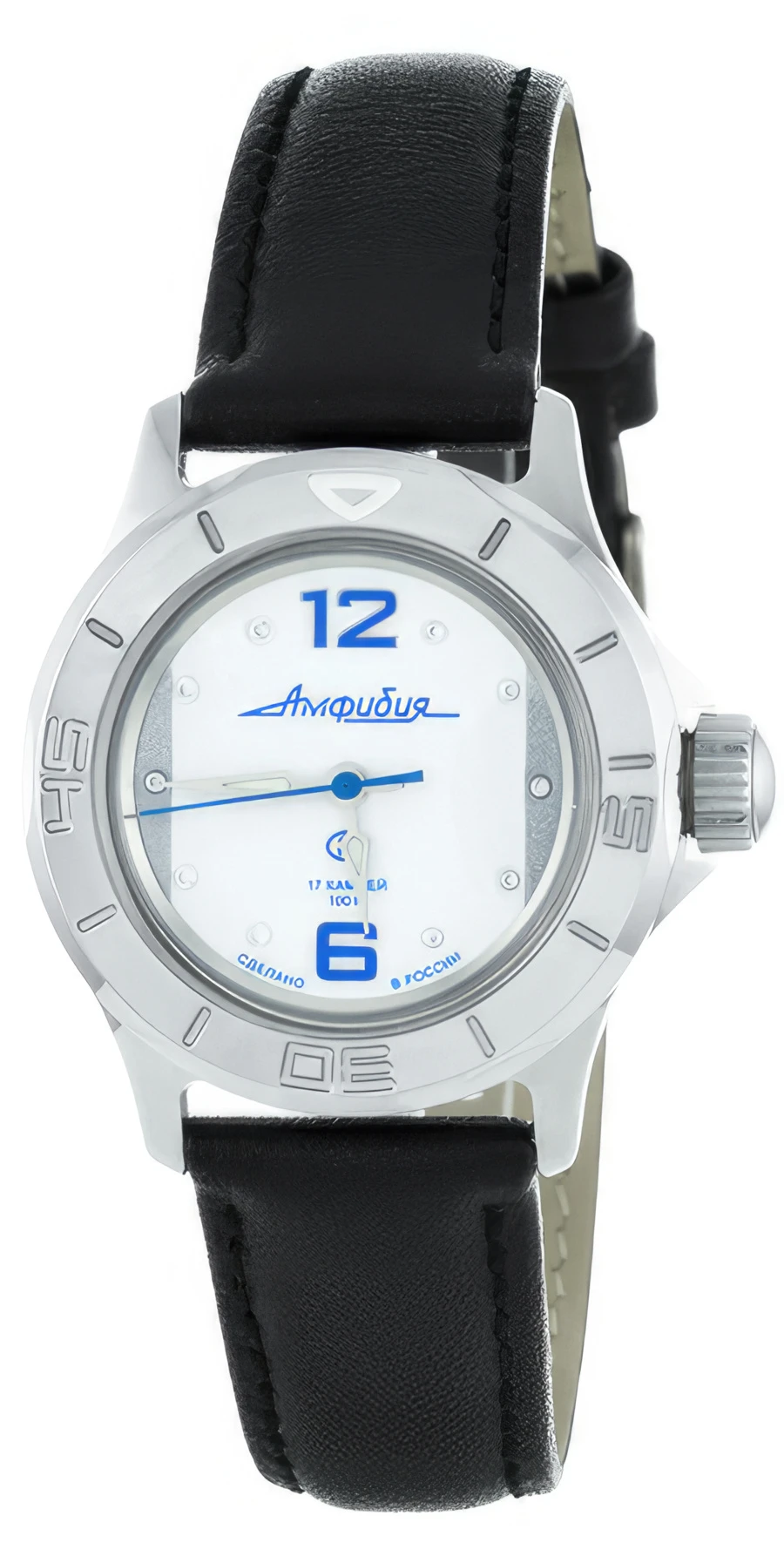 Женские наручные часы Восток Амфибия 051230. Механические с автоподзаводом. Пружина механизма заводится автоматически благодаря естественным движениям владельца в процессе ежедневной носки часов. Корпус изготовлен из высококачественной нержавеющей стали 316L с высокими антикоррозийными свойствами. На стрелки и отметки нанесен светонакопительный состав, благодаря этому считывать информацию с циферблата возможно и в темноте. Ремешок изготовлен из кожи. Органическое стекло. Часы являются водонепроницаемыми до 10 Бар. Цвет циферблата: Белый. Ширина (с заводной головкой): 33мм. Толщина: 11мм. Гарантия: 1 год.
