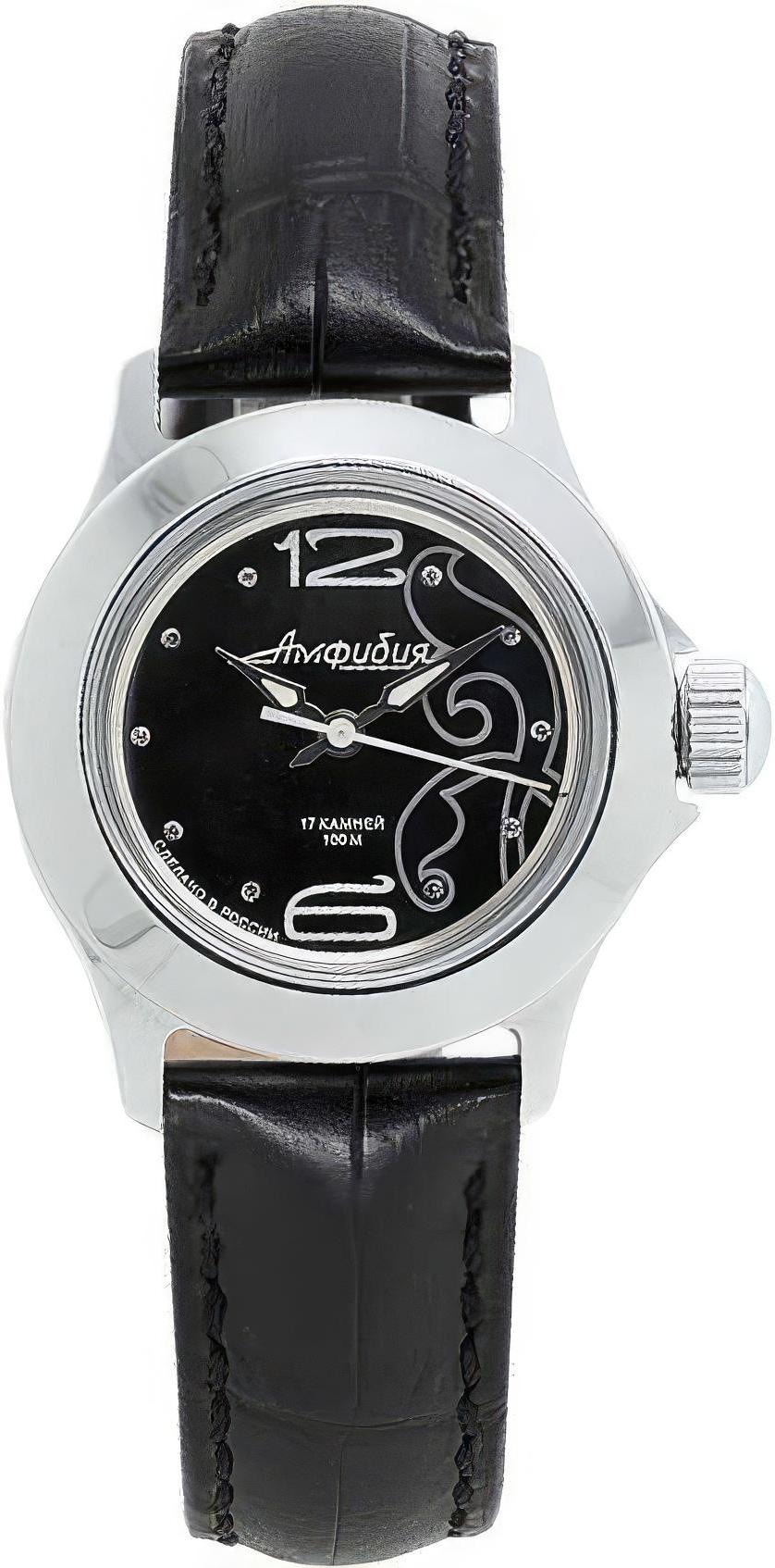 Женские наручные часы Восток Амфибия 051343. Механические с автоподзаводом. Пружина механизма заводится автоматически благодаря естественным движениям владельца в процессе ежедневной носки часов. Корпус изготовлен из высококачественной нержавеющей стали 316L с высокими антикоррозийными свойствами. На стрелки и отметки нанесен светонакопительный состав, благодаря этому считывать информацию с циферблата возможно и в темноте. Ремешок изготовлен из кожи. Органическое стекло. Часы являются водонепроницаемыми до 10 Бар. Цвет циферблата: Черный. Ширина (с заводной головкой): 33мм. Толщина: 11мм. Гарантия: 1 год.