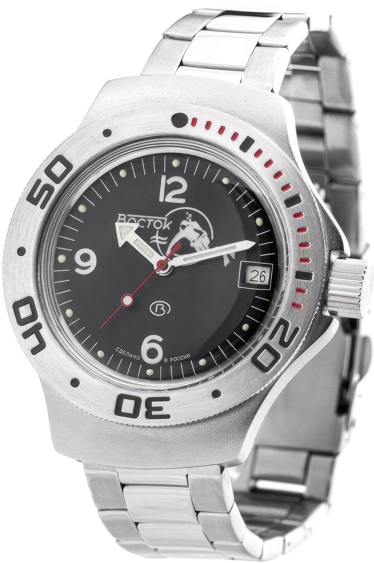Мужские наручные часы Восток Амфибия 060634. Механические с автоподзаводом. Пружина механизма заводится автоматически благодаря естественным движениям владельца в процессе ежедневной носки часов. Корпус изготовлен из высококачественной нержавеющей стали 316L с высокими антикоррозийными свойствами. На стрелки и отметки нанесен светонакопительный состав, благодаря этому считывать информацию с циферблата возможно и в темноте. На циферблате отображается текущее число месяца. Браслет из нержавеющей стали. Органическое стекло. Часы являются водонепроницаемыми до 20 Бар. Цвет корпуса: Двухцветный. Цвет циферблата: Черный. Ширина (с заводной головкой): 42мм. Толщина: 13мм. Гарантия: 1 год.