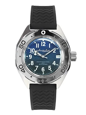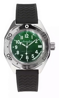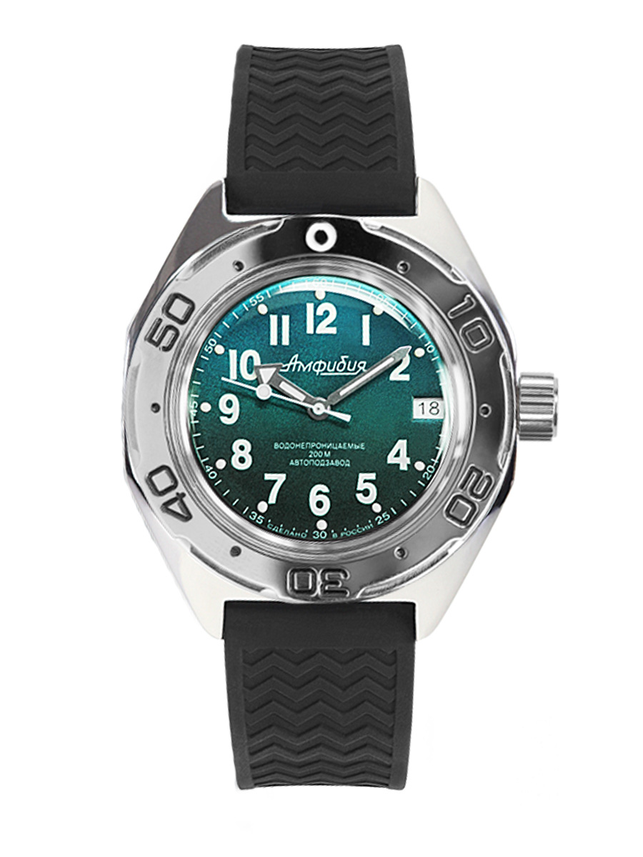 Мужские наручные часы Восток Амфибия 67067Б. Механические с ручным подзаводом. Силиконовый ремешок. Ударопрочная конструкция часов защищает от ударов и вибрации. Аккумулятор обеспечивает часы достаточным питанием приблизительно на 10 лет. Браслет из нержавеющей стали. Органическое стекло. На циферблате отображается текущее число месяца. Часы являются водонепроницаемыми до 20 Бар. Цвет циферблата: Серебристый. Цвет корпуса: Зеленый. На стрелки и отметки нанесен светонакопительный состав, благодаря этому считывать информацию с циферблата возможно и в темноте. Высота (с ушками): 50 мм. Толщина: 15 мм. Гарантия: 1 год.