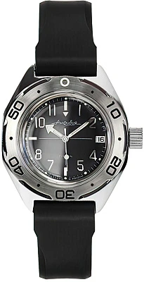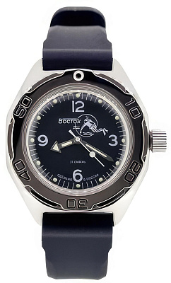 Мужские наручные часы Восток Амфибия 670922. Механические с автоподзаводом. Пружина механизма заводится автоматически благодаря естественным движениям владельца в процессе ежедневной носки часов. Корпус изготовлен из высококачественной нержавеющей стали 316L с высокими антикоррозийными свойствами. На стрелки и отметки нанесен светонакопительный состав, благодаря этому считывать информацию с циферблата возможно и в темноте. На циферблате отображается текущее число месяца. Ремешок изготовлен из каучука. Органическое стекло. Часы являются водонепроницаемыми до 20 Бар. Цвет корпуса: Черный. Цвет циферблата: Черный. Ширина (с заводной головкой): 41мм. Толщина: 10мм. Гарантия: 1 год.