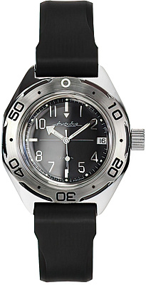 Мужские наручные часы Восток Амфибия 670923. Механические с автоподзаводом. Пружина механизма заводится автоматически благодаря естественным движениям владельца в процессе ежедневной носки часов. Корпус изготовлен из высококачественной нержавеющей стали 316L с высокими антикоррозийными свойствами. На стрелки и отметки нанесен светонакопительный состав, благодаря этому считывать информацию с циферблата возможно и в темноте. На циферблате отображается текущее число месяца. Полимерный ремешок. Натуральный полимерный материал является идеальным для изготовления ремешка благодаря своей чрезвычайной прочности и гибкости. Органическое стекло. Часы являются водонепроницаемыми до 20 Бар. Цвет корпуса: Черный. Цвет циферблата: Черный. Ширина (с заводной головкой): 40мм. Толщина: 10мм. Гарантия: 1 год.