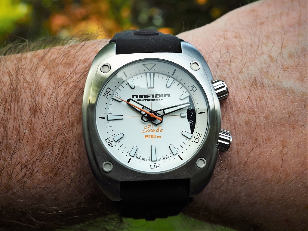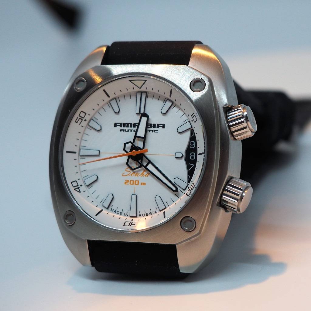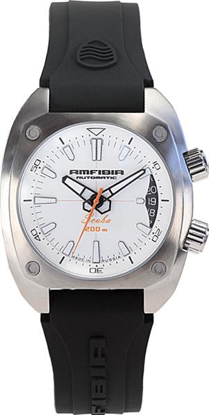 Мужские наручные часы Восток Амфибия 070799. Механические с автоподзаводом. Пружина механизма заводится автоматически благодаря естественным движениям владельца в процессе ежедневной носки часов. Корпус изготовлен из высококачественной нержавеющей стали 316L с высокими антикоррозийными свойствами. На стрелки и отметки нанесен светонакопительный состав, благодаря этому считывать информацию с циферблата возможно и в темноте. На циферблате отображается текущее число месяца. Ремешок изготовлен из каучука. Прочное, устойчивое к царапинам минеральное стекло защищает часы от повреждений. Часы являются водонепроницаемыми до 20 Бар. Ширина (с заводной головкой): 41мм. Толщина: 13мм. Гарантия: 1 год.