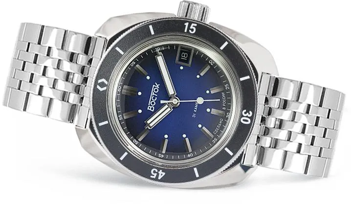 Мужские наручные часы Восток Амфибия 71001А. Механические с ручным подзаводом. Браслет из нержавеющей стали. Браслет из нержавеющей стали. Органическое стекло. На циферблате отображается текущее число месяца. Часы являются водонепроницаемыми до 18 Бар. Цвет циферблата: Серебристый. Цвет циферблата: Черный. Цвет корпуса: Синий. На стрелки и отметки нанесен светонакопительный состав, благодаря этому считывать информацию с циферблата возможно и в темноте. Толщина: 12 мм. Гарантия: 1 год.