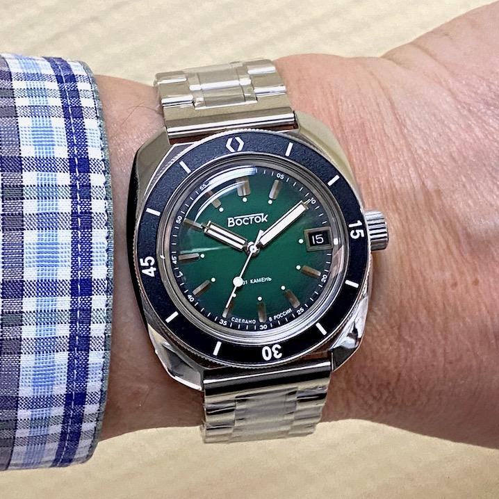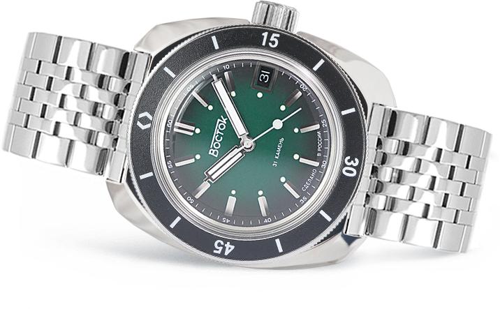 Мужские наручные часы Восток Амфибия 71002А. Механические с ручным подзаводом. Корпус изготовлен из высококачественной нержавеющей стали 316L с высокими антикоррозийными свойствами. На стрелки и отметки нанесен светонакопительный состав, благодаря этому считывать информацию с циферблата возможно и в темноте. На циферблате отображается текущее число месяца. Браслет из нержавеющей стали. Органическое стекло. Часы являются водонепроницаемыми до 20 Бар. Цвет корпуса: Черный. Цвет циферблата: Зеленый. Ширина (с заводной головкой): 38мм. Толщина: 12мм. Гарантия: 1 год.