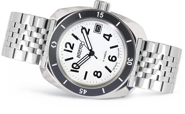 Мужские наручные часы Восток Амфибия 71009А. Механические с ручным подзаводом. Браслет из нержавеющей стали. Браслет из нержавеющей стали. Органическое стекло. На циферблате отображается текущее число месяца. Часы являются водонепроницаемыми до 20 Бар. Цвет циферблата: Серебристый. Цвет циферблата: Черный. Цвет корпуса: Белый. На стрелки и отметки нанесен светонакопительный состав, благодаря этому считывать информацию с циферблата возможно и в темноте. Толщина: 12 мм. Гарантия: 1 год.