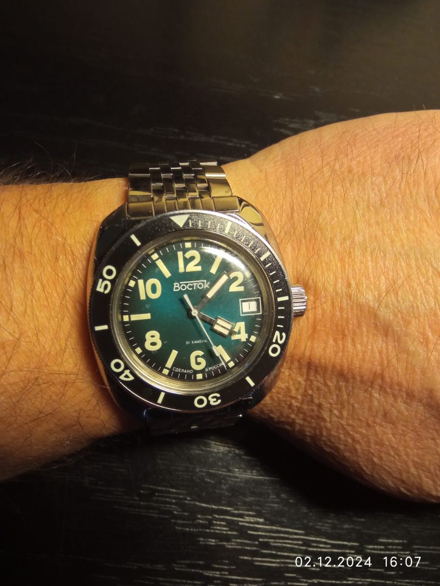 Мужские наручные часы Восток Амфибия 71050В. Механические с ручным подзаводом. Браслет из нержавеющей стали. Ударопрочная конструкция часов защищает от ударов и вибрации. Браслет из нержавеющей стали. Органическое стекло. На циферблате отображается текущее число месяца. Часы являются водонепроницаемыми до 20 Бар. Цвет циферблата: Черный. Цвет корпуса: Зеленый. На стрелки и отметки нанесен светонакопительный состав, благодаря этому считывать информацию с циферблата возможно и в темноте. Высота (с ушками): 46 мм. Толщина: 15 мм. Гарантия: 1 год.