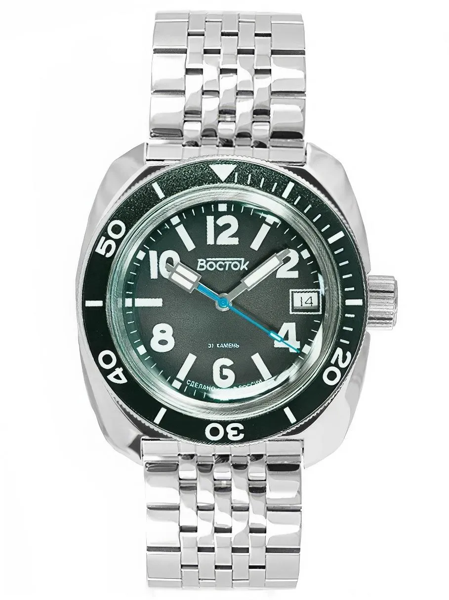 Мужские наручные часы Восток Амфибия 71052В. Механические с ручным подзаводом. Браслет из нержавеющей стали. Ударопрочная конструкция часов защищает от ударов и вибрации. Браслет из нержавеющей стали. Органическое стекло. На циферблате отображается текущее число месяца. Часы являются водонепроницаемыми до 20 Бар. Цвет циферблата: Черный. Цвет корпуса: Черный. На стрелки и отметки нанесен светонакопительный состав, благодаря этому считывать информацию с циферблата возможно и в темноте. Высота (с ушками): 46 мм. Толщина: 15 мм. Гарантия: 1 год.
