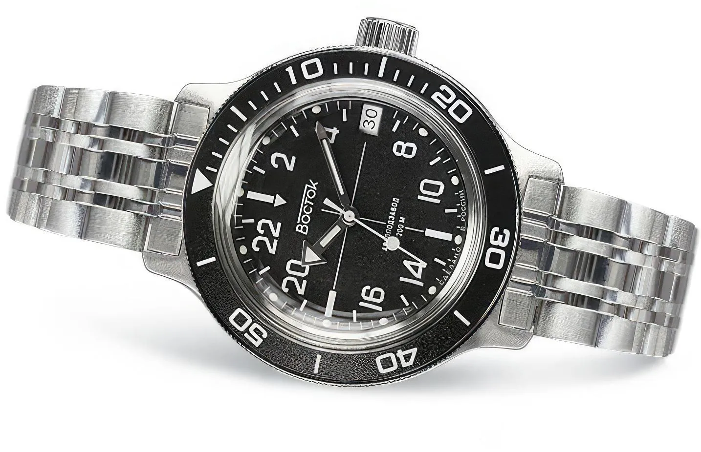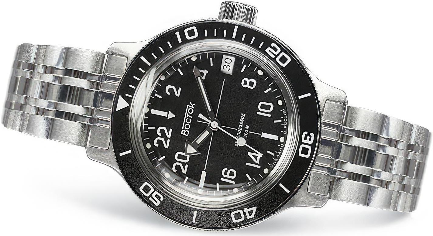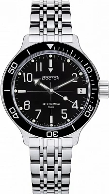 Мужские наручные часы Восток Амфибия 720076. Механические с ручным подзаводом. Браслет из нержавеющей стали. Браслет из нержавеющей стали. Органическое стекло. На циферблате отображается текущее число месяца. Часы являются водонепроницаемыми до 20 Бар. Цвет циферблата: Серебристый. Цвет циферблата: Черный. Цвет корпуса: Черный. На стрелки и отметки нанесен светонакопительный состав, благодаря этому считывать информацию с циферблата возможно и в темноте. Толщина: 12 мм. Гарантия: 1 год.