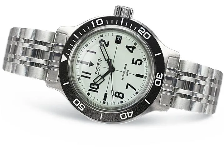 Мужские наручные часы Восток Амфибия 72012Б. Механические с ручным подзаводом. Браслет из нержавеющей стали. Браслет из нержавеющей стали. Органическое стекло. На циферблате отображается текущее число месяца. Часы являются водонепроницаемыми до 20 Бар. Цвет циферблата: Серебристый. Цвет циферблата: Черный. Цвет корпуса: Белый. На стрелки и отметки нанесен светонакопительный состав, благодаря этому считывать информацию с циферблата возможно и в темноте. Толщина: 12 мм. Гарантия: 1 год.