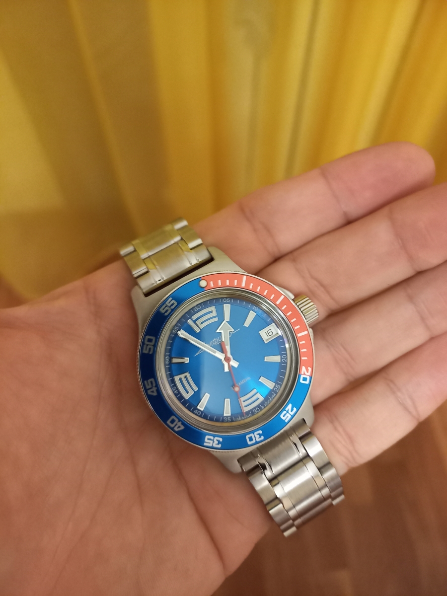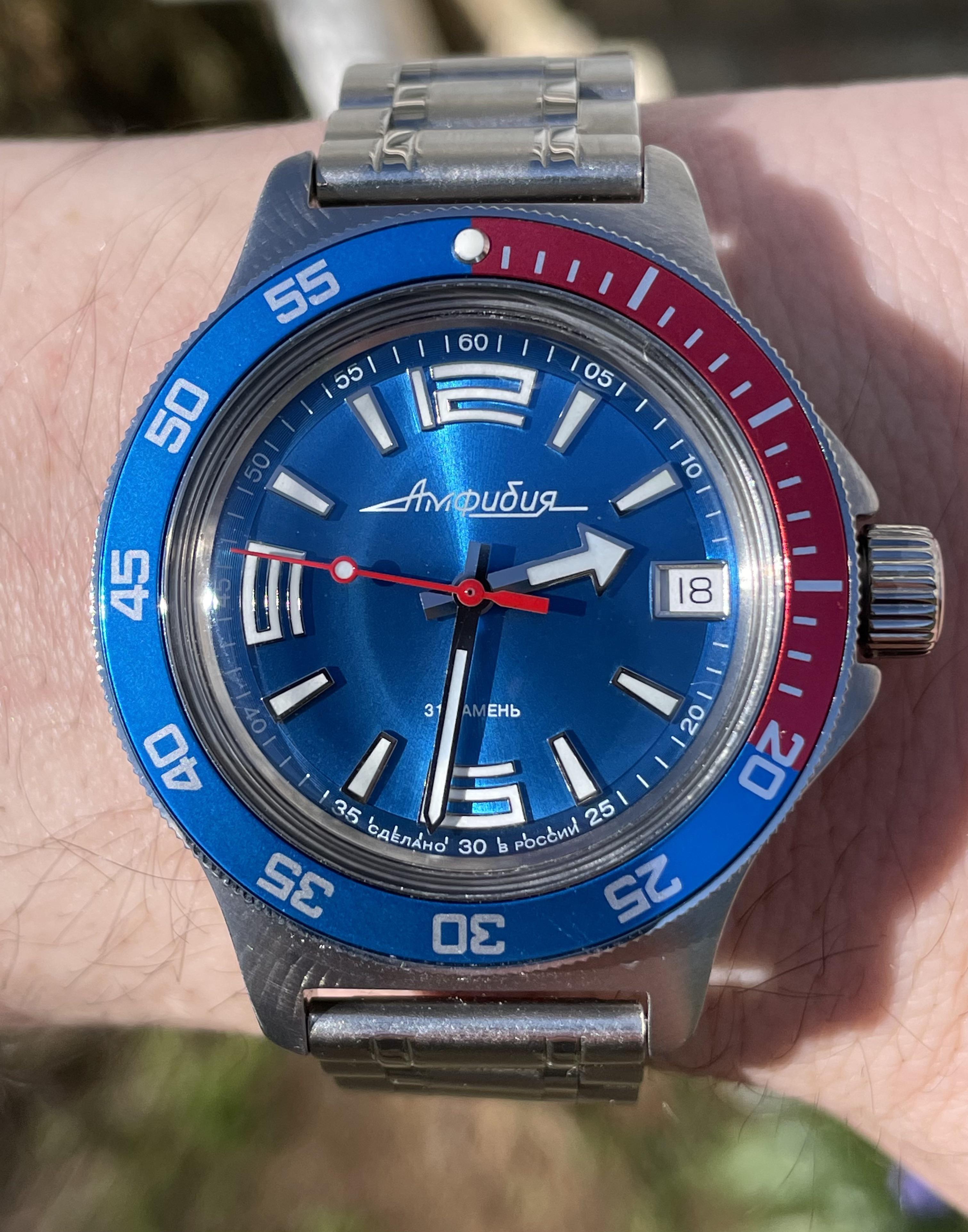 Мужские наручные часы Восток Амфибия 740376. Механические с ручным подзаводом. Браслет из нержавеющей стали. Ударопрочная конструкция часов защищает от ударов и вибрации. Браслет из нержавеющей стали. Органическое стекло. На циферблате отображается текущее число месяца. Часы являются водонепроницаемыми до 20 Бар. Цвет циферблата: Красный. Цвет циферблата: Серебристый. Цвет циферблата: Синий. Цвет корпуса: Синий. На стрелки и отметки нанесен светонакопительный состав, благодаря этому считывать информацию с циферблата возможно и в темноте. Толщина: 13 мм. Гарантия: 1 год.