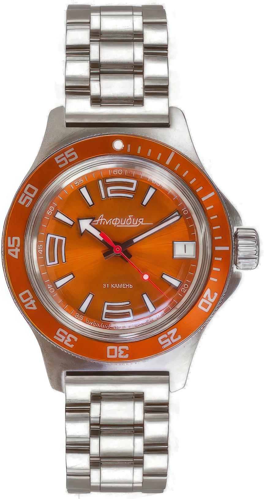 Мужские наручные часы Восток Амфибия 740383. Механические с ручным подзаводом. Браслет из нержавеющей стали. Ударопрочная конструкция часов защищает от ударов и вибрации. Браслет из нержавеющей стали. Органическое стекло. На циферблате отображается текущее число месяца. Часы являются водонепроницаемыми до 20 Бар. Цвет циферблата: Оранжевый. Цвет циферблата: Серебристый. Цвет корпуса: Оранжевый. На стрелки и отметки нанесен светонакопительный состав, благодаря этому считывать информацию с циферблата возможно и в темноте. Толщина: 12 мм. Гарантия: 1 год.