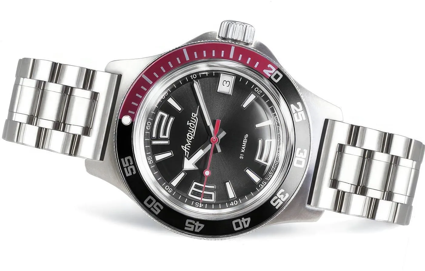 Мужские наручные часы Восток Амфибия 740387. Механические с ручным подзаводом. Браслет из нержавеющей стали. Браслет из нержавеющей стали. Органическое стекло. На циферблате отображается текущее число месяца. Часы являются водонепроницаемыми до 20 Бар. Цвет циферблата: Красный. Цвет циферблата: Серебристый. Цвет циферблата: Черный. Цвет корпуса: Черный. На стрелки и отметки нанесен светонакопительный состав, благодаря этому считывать информацию с циферблата возможно и в темноте. Толщина: 13 мм. Гарантия: 1 год.