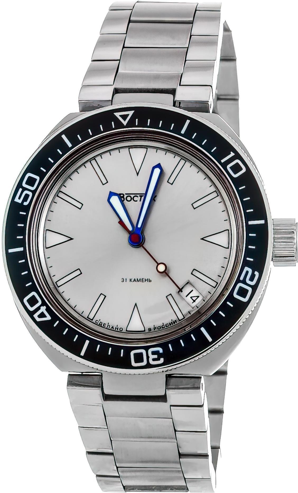 Мужские наручные часы Восток Амфибия 780830. Автоматические с ручным подзаводом. Пружина механизма заводится автоматически благодаря естественным движениям владельца в процессе ежедневной носки часов. Также есть возможность ручного завода. Браслет из нержавеющей стали. Ударопрочная конструкция часов защищает от ударов и вибрации. Браслет из нержавеющей стали. Органическое стекло. На циферблате отображается текущее число месяца. Часы являются водонепроницаемыми до 20 Бар. Цвет циферблата: Серебристый. Цвет циферблата: Черный. Цвет корпуса: Серый. На стрелки и отметки нанесен светонакопительный состав, благодаря этому считывать информацию с циферблата возможно и в темноте. Толщина: 12 мм. Гарантия: 1 год.