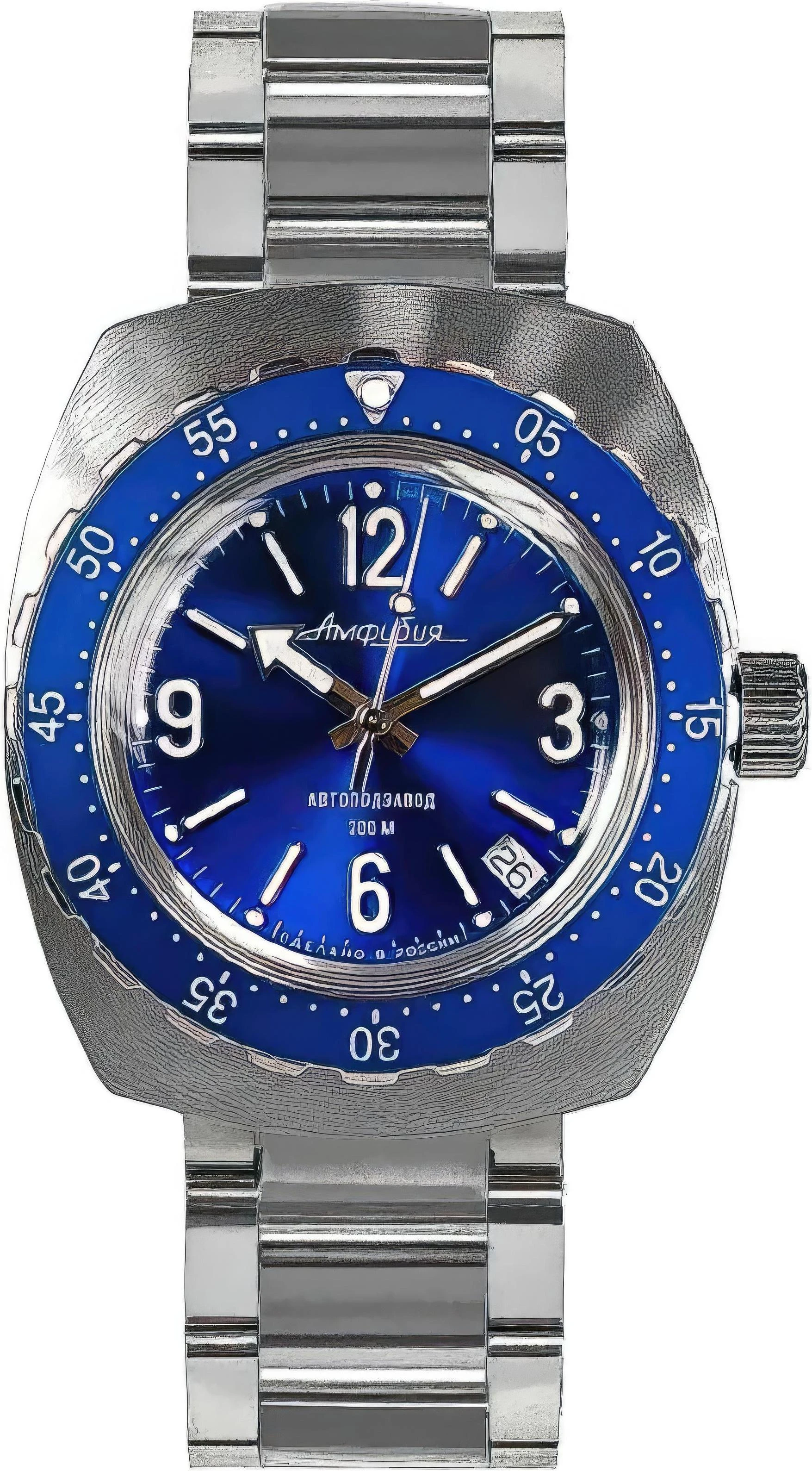 Мужские наручные часы Восток Амфибия 900971. Механические с ручным подзаводом. Браслет из нержавеющей стали. Ударопрочная конструкция часов защищает от ударов и вибрации. Браслет изготовлен из алюминия. Органическое стекло. На циферблате отображается текущее число месяца. Часы являются водонепроницаемыми до 20 Бар. Цвет циферблата: Серебристый. Цвет циферблата: Синий. Цвет корпуса: Синий. На стрелки и отметки нанесен светонакопительный состав, благодаря этому считывать информацию с циферблата возможно и в темноте. Толщина: 13 мм. Гарантия: 1 год.