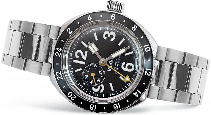 Мужские наручные часы Восток Амфибия 96071А. Механические с ручным подзаводом. Браслет из нержавеющей стали. Браслет из нержавеющей стали. Органическое стекло. Часы являются водонепроницаемыми до 20 Бар. Цвет циферблата: Серебристый. Цвет циферблата: Черный. Цвет корпуса: Черный. На стрелки и отметки нанесен светонакопительный состав, благодаря этому считывать информацию с циферблата возможно и в темноте. Толщина: 13 мм. Гарантия: 1 год.