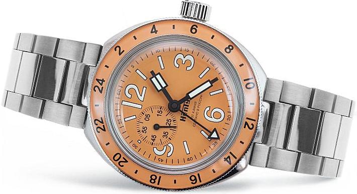 Мужские наручные часы Восток Амфибия 96075А. Механические с ручным подзаводом. Браслет из нержавеющей стали. Браслет из нержавеющей стали. Органическое стекло. Часы являются водонепроницаемыми до 20 Бар. Цвет циферблата: Оранжевый. Цвет циферблата: Серебристый. Цвет корпуса: Оранжевый. На стрелки и отметки нанесен светонакопительный состав, благодаря этому считывать информацию с циферблата возможно и в темноте. Толщина: 13 мм. Гарантия: 1 год.