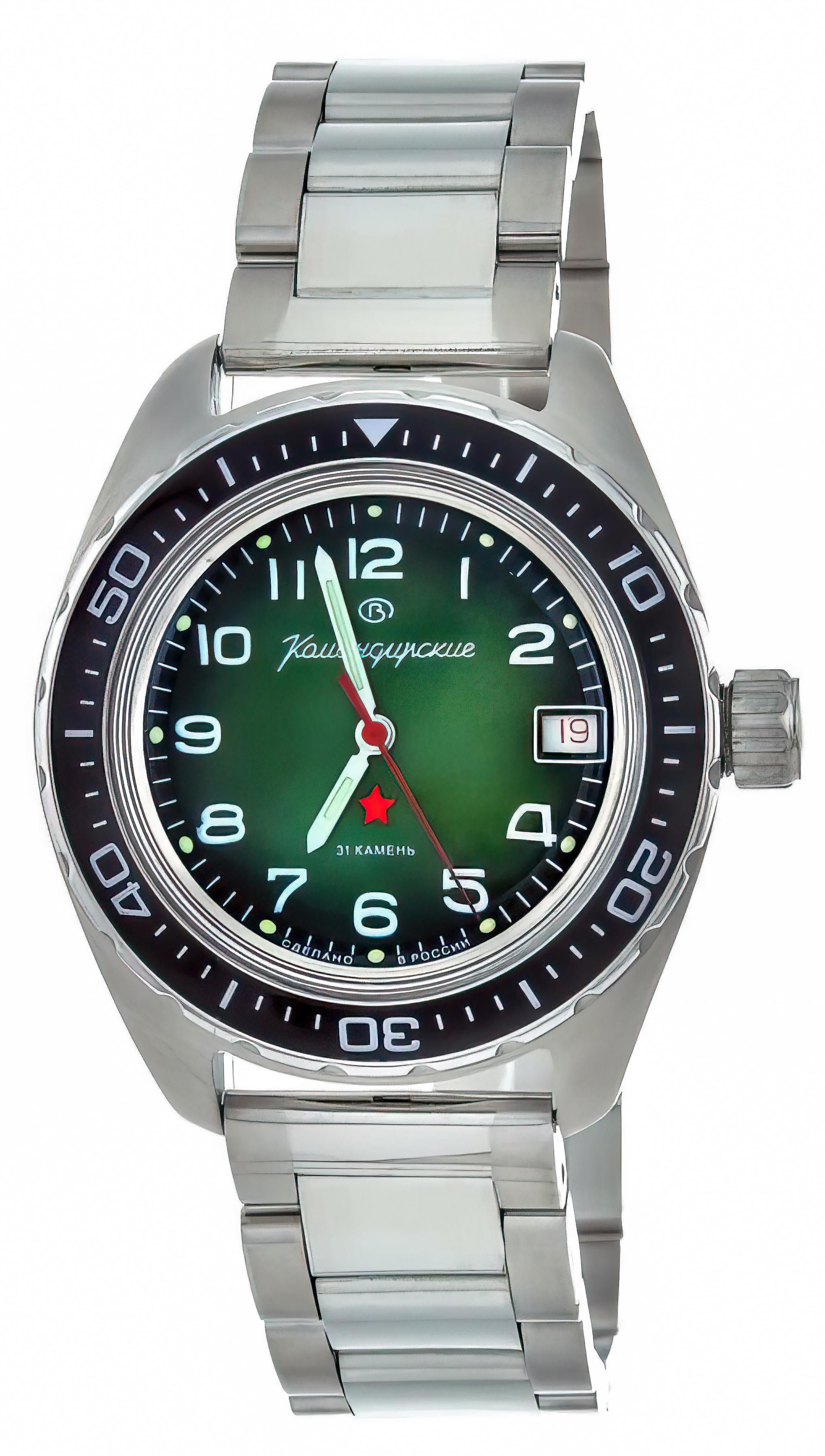 Мужские наручные часы Восток Командирские 02033А. Механические с ручным подзаводом. Браслет из нержавеющей стали. Браслет из нержавеющей стали. Органическое стекло. На циферблате отображается текущее число месяца. Часы являются водонепроницаемыми до 20 Бар. Цвет циферблата: Серебристый. Цвет циферблата: Черный. Цвет корпуса: Зеленый. На стрелки и отметки нанесен светонакопительный состав, благодаря этому считывать информацию с циферблата возможно и в темноте. Толщина: 15 мм. Гарантия: 1 год.