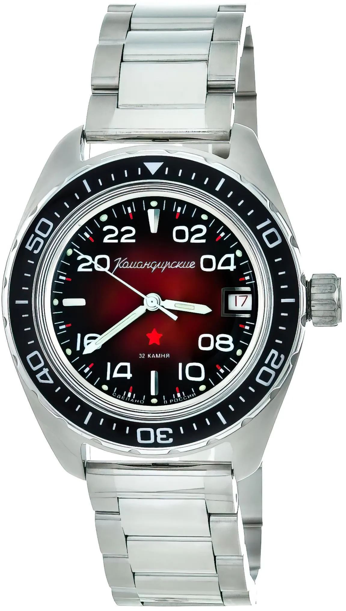 Мужские наручные часы Восток Командирские 02039А. Механические с ручным подзаводом. Браслет из нержавеющей стали. Браслет из нержавеющей стали. Органическое стекло. На циферблате отображается текущее число месяца. Часы являются водонепроницаемыми до 20 Бар. Цвет циферблата: Серебристый. Цвет циферблата: Черный. Цвет корпуса: Красный. Цвет корпуса: Черный. На стрелки и отметки нанесен светонакопительный состав, благодаря этому считывать информацию с циферблата возможно и в темноте. Толщина: 15 мм. Гарантия: 1 год.