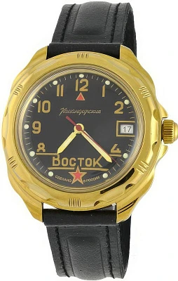 <b>Мужские наручные часы Восток Командирские 219524.</b> Механические с ручным подзаводом. Корпус изготовлен из высококачественной часовой латуни с высокими антикоррозийными свойствами. На стрелки и отметки нанесен светонакопительный состав, благодаря этому считывать информацию с циферблата возможно и в темноте. На циферблате отображается текущее число месяца. Ремешок изготовлен из кожи. Прочное, устойчивое к царапинам минеральное стекло защищает часы от повреждений.Часы являются водонепроницаемыми до 3 Бар. Цвет корпуса: Желтое золото. Цвет циферблата: Черный. Ширина (с заводной головкой): 40мм. Толщина: 10мм. Гарантия: 1 год.