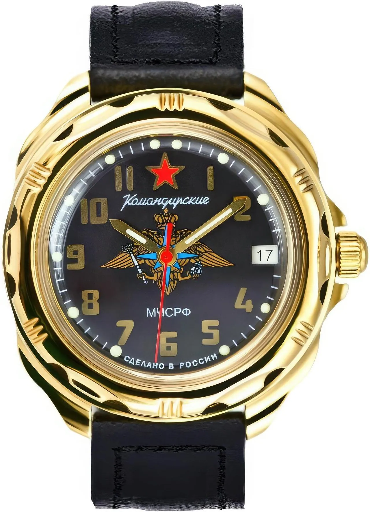 Мужские наручные часы Восток Командирские 219639. Механические с ручным подзаводом. Корпус изготовлен из высококачественной часовой латуни с высокими антикоррозийными свойствами. На стрелки и отметки нанесен светонакопительный состав, благодаря этому считывать информацию с циферблата возможно и в темноте. На циферблате отображается текущее число месяца. Ремешок изготовлен из кожи. Органическое стекло. Часы являются водонепроницаемыми до 3 Бар. Цвет корпуса: Желтое золото. Цвет циферблата: Черный. Ширина (с заводной головкой): 40мм. Толщина: 10мм. Гарантия: 1 год.