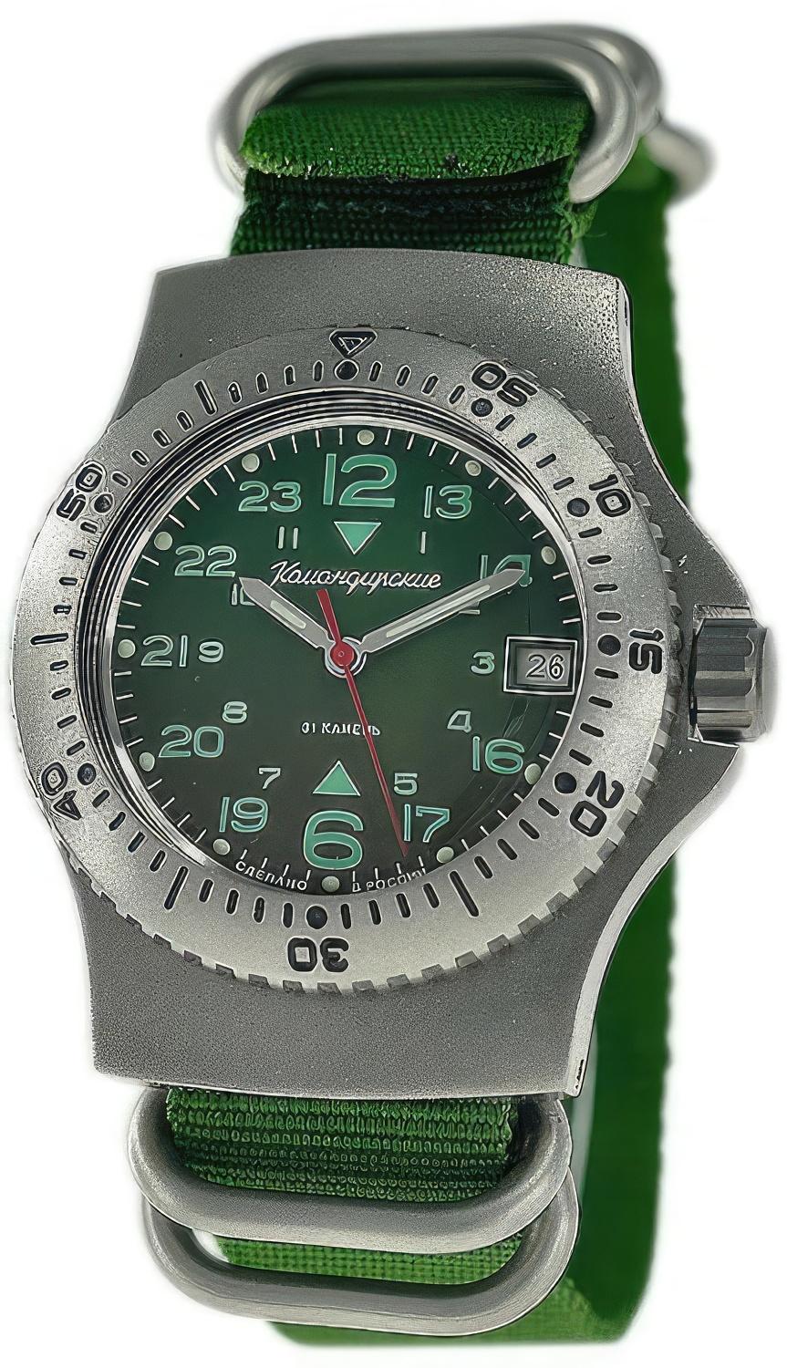 Мужские наручные часы Восток Командирские 280989. Механические с ручным подзаводом. Корпус изготовлен из высококачественной нержавеющей стали 316L с высокими антикоррозийными свойствами. На стрелки и отметки нанесен светонакопительный состав, благодаря этому считывать информацию с циферблата возможно и в темноте. На циферблате отображается текущее число месяца. Текстильный ремешок. Органическое стекло. Часы являются водонепроницаемыми до 20 Бар. Цвет корпуса: Серый. Цвет циферблата: Зеленый. Гарантия: 1 год.
