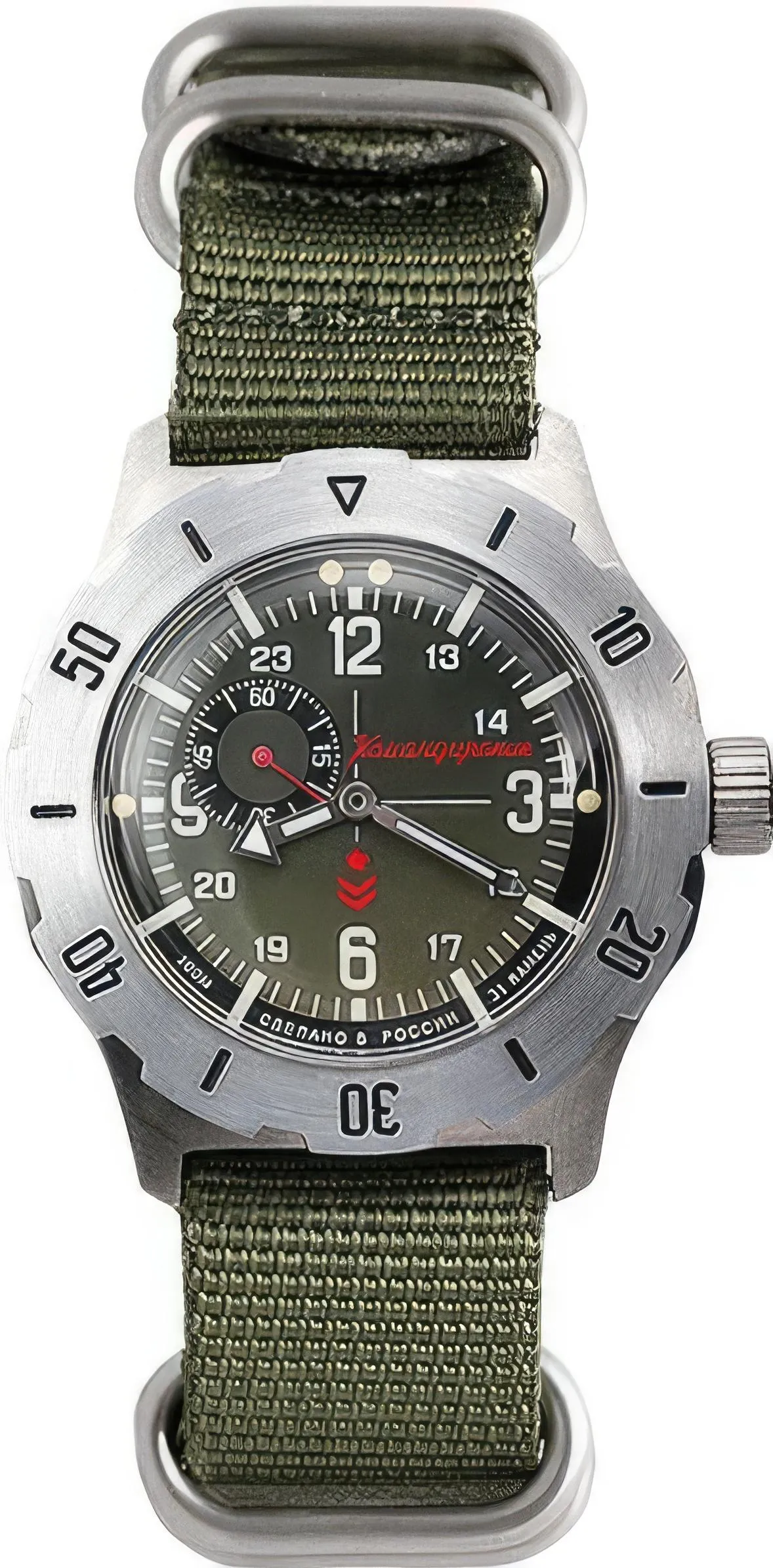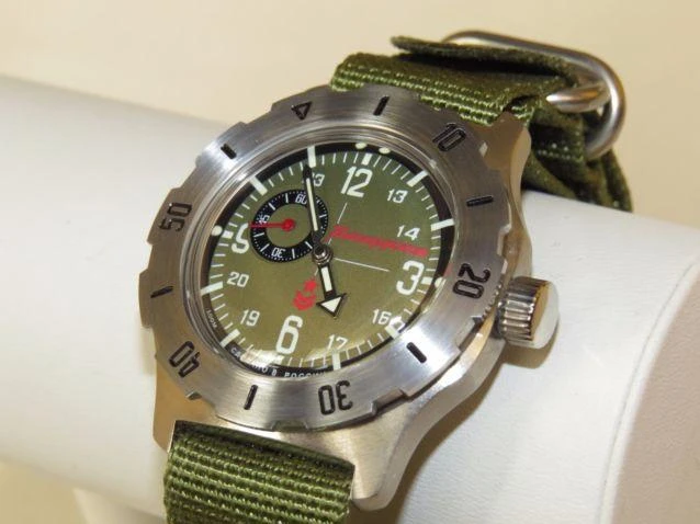 Мужские наручные часы Восток Командирские 350501. Автоматические с ручным подзаводом. Пружина механизма заводится автоматически благодаря естественным движениям владельца в процессе ежедневной носки часов. Также есть возможность ручного завода. Корпус изготовлен из высококачественной нержавеющей стали 316L с высокими антикоррозийными свойствами. На стрелки и отметки нанесен светонакопительный состав, благодаря этому считывать информацию с циферблата возможно и в темноте. Текстильный ремешок. Органическое стекло. Часы являются водонепроницаемыми до 10 Бар. Цвет корпуса: Двухцветный. Цвет циферблата: Зеленый. Ширина (с заводной головкой): 42мм. Толщина: 15мм. Гарантия: 1 год.