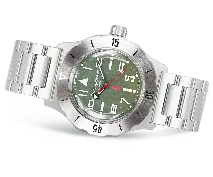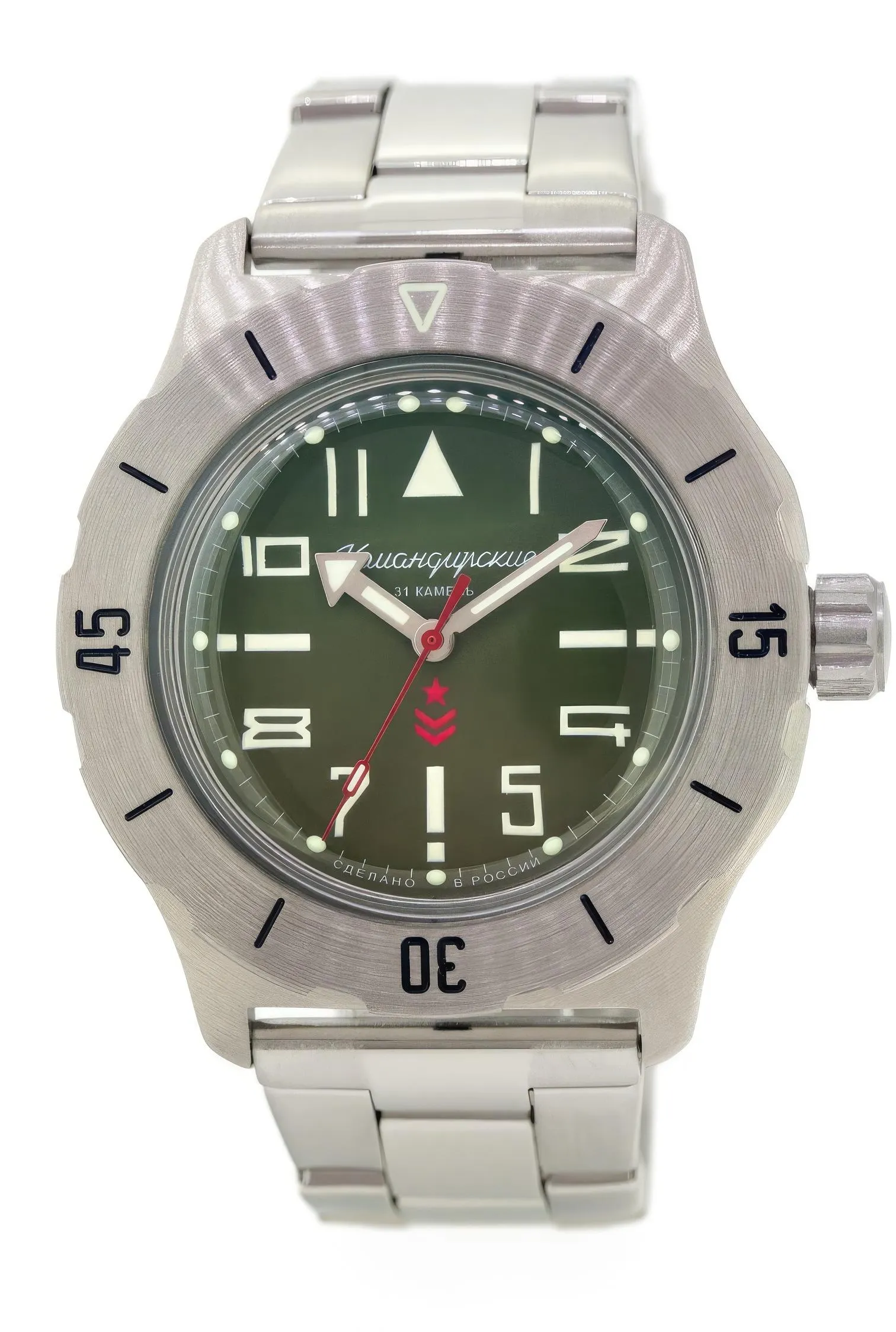 Мужские наручные часы Восток Командирские 350746. Автоматические с ручным подзаводом. Пружина механизма заводится автоматически благодаря естественным движениям владельца в процессе ежедневной носки часов. Также есть возможность ручного завода. Корпус изготовлен из высококачественной нержавеющей стали 316L с высокими антикоррозийными свойствами. На стрелки и отметки нанесен светонакопительный состав, благодаря этому считывать информацию с циферблата возможно и в темноте. Текстильный ремешок. Органическое стекло. Часы являются водонепроницаемыми до 10 Бар. Цвет корпуса: Двухцветный. Цвет циферблата: Зеленый. Ширина (с заводной головкой): 42мм. Толщина: 15мм. Гарантия: 1 год.