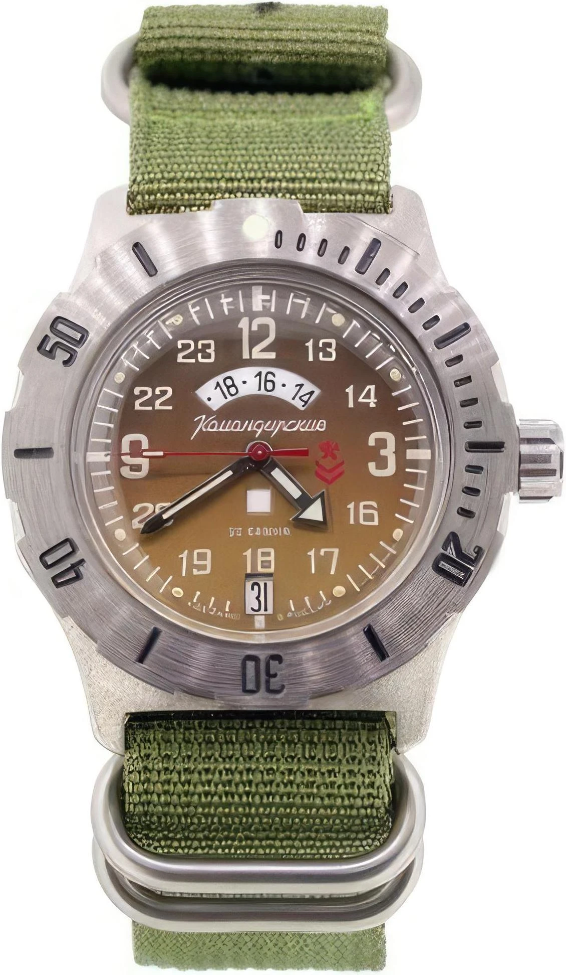 Мужские наручные часы Восток Командирские 350754. Автоматические с ручным подзаводом. Пружина механизма заводится автоматически благодаря естественным движениям владельца в процессе ежедневной носки часов. Также есть возможность ручного завода. Корпус изготовлен из высококачественной нержавеющей стали 316L с высокими антикоррозийными свойствами. На стрелки и отметки нанесен светонакопительный состав, благодаря этому считывать информацию с циферблата возможно и в темноте. На циферблате отображается текущее число месяца. Текстильный ремешок. Органическое стекло. Часы являются водонепроницаемыми до 10 Бар. Цвет корпуса: Двухцветный. Цвет циферблата: Коричневый. Ширина (с заводной головкой): 42мм. Толщина: 15мм. Гарантия: 1 год.