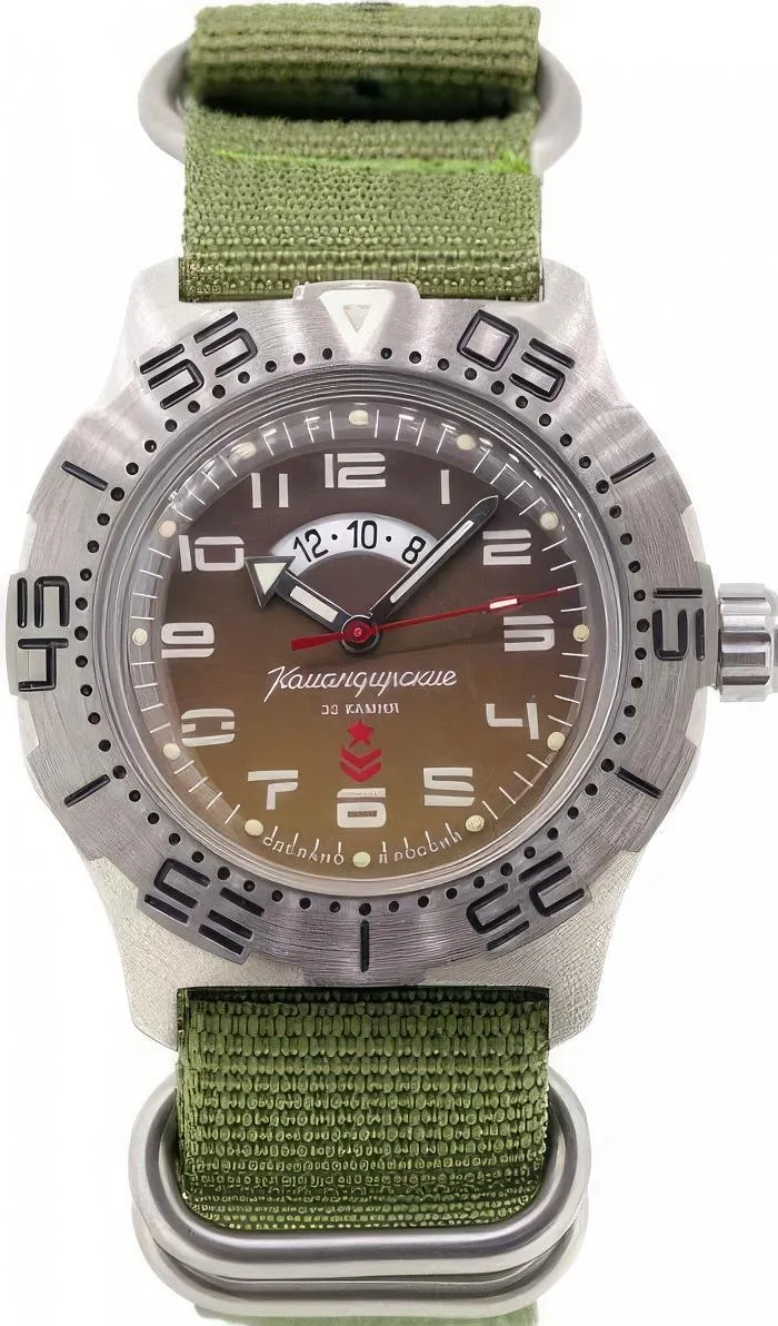 <b>Мужские наручные часы Восток Командирские 350755.</b> Автоматические с ручным подзаводом. Пружина механизма заводится автоматически благодаря естественным движениям владельца в процессе ежедневной носки часов. Также есть возможность ручного завода. Корпус изготовлен из высококачественной нержавеющей стали 316L с высокими антикоррозийными свойствами. На стрелки и отметки нанесен светонакопительный состав, благодаря этому считывать информацию с циферблата возможно и в темноте. Текстильный ремешок. Органическое стекло. Часы являются водонепроницаемыми до 10 Бар. Цвет корпуса: Серебристый. Цвет циферблата: Коричневый. Ширина (с заводной головкой): 40мм. Толщина: 12мм. Гарантия: 1 год.
